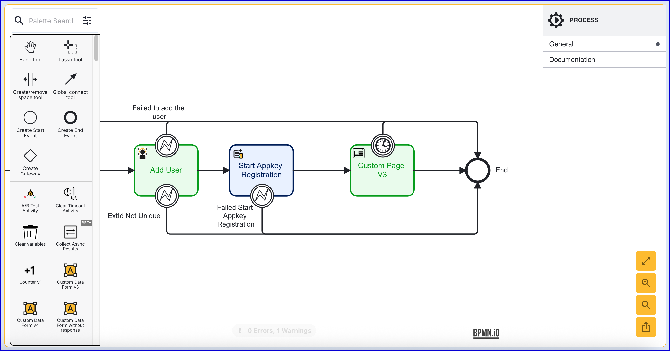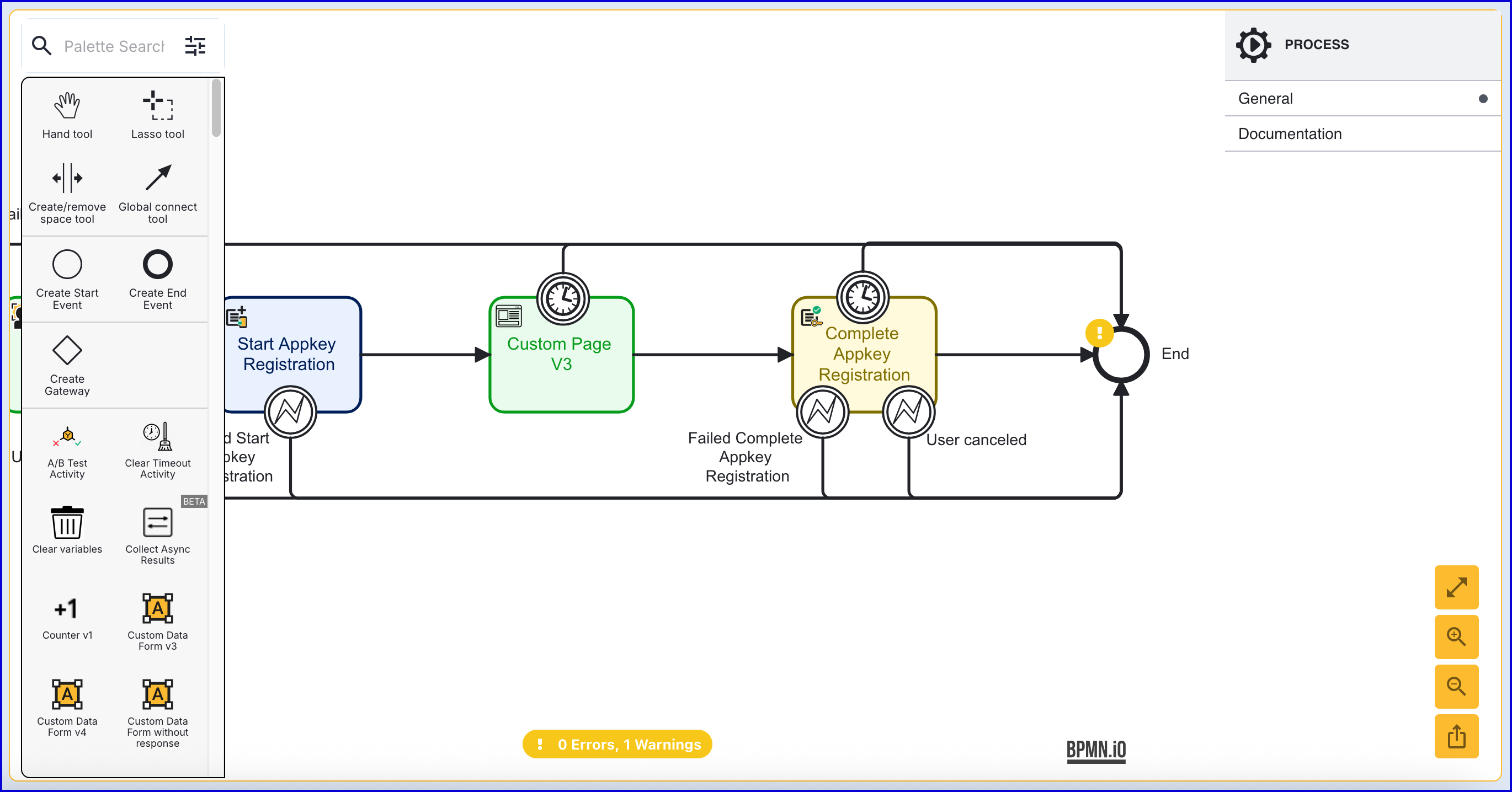 - Once the Custom Page has been created, add a 'Custom Page V3' activity to the Process Definition and connect it to the 'Start Appkey Registration' activity.