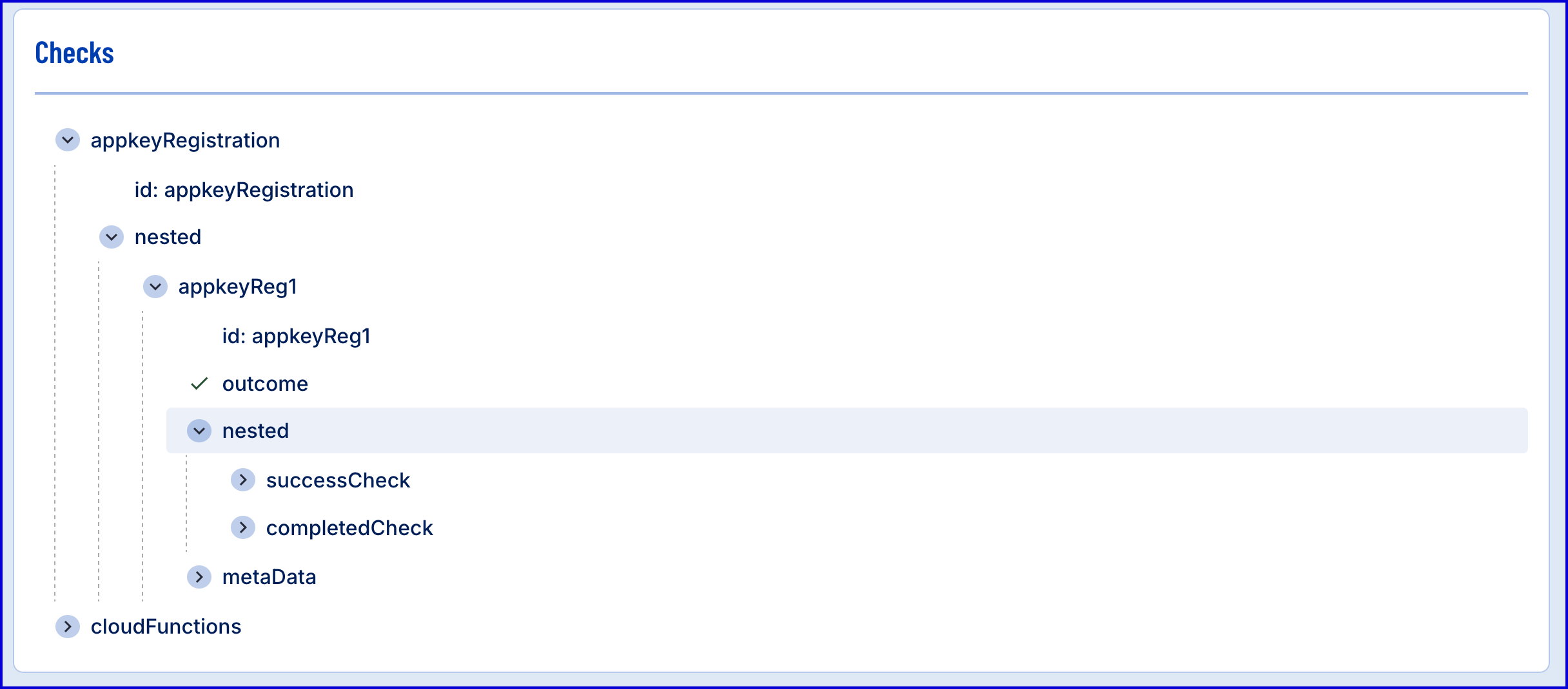 - From the individual Process Instance page, details about the Appkey authentication can be found listed under the 'Checks' section as 'appkeyRegistration'.