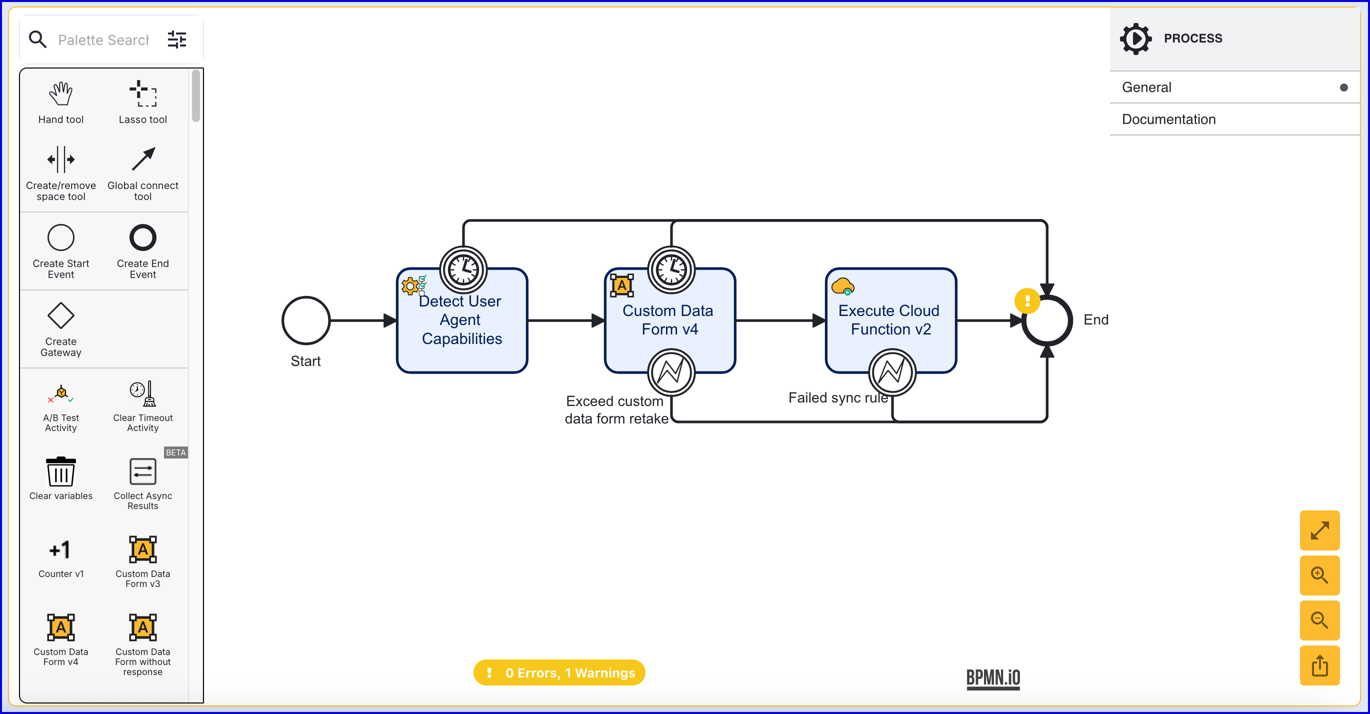 - In the Process Designer, add a 'Custom Data Form v3' activity and connect it to the 'Detect User Agent Capabilities'.
