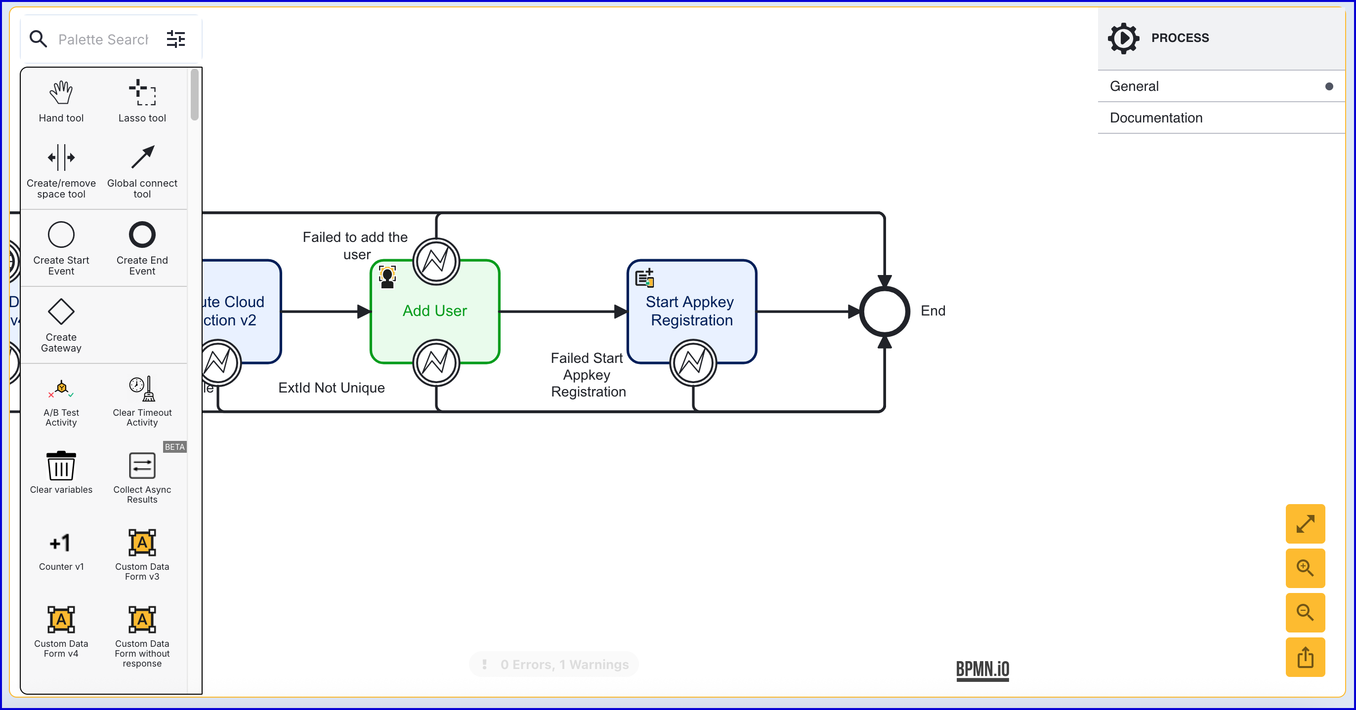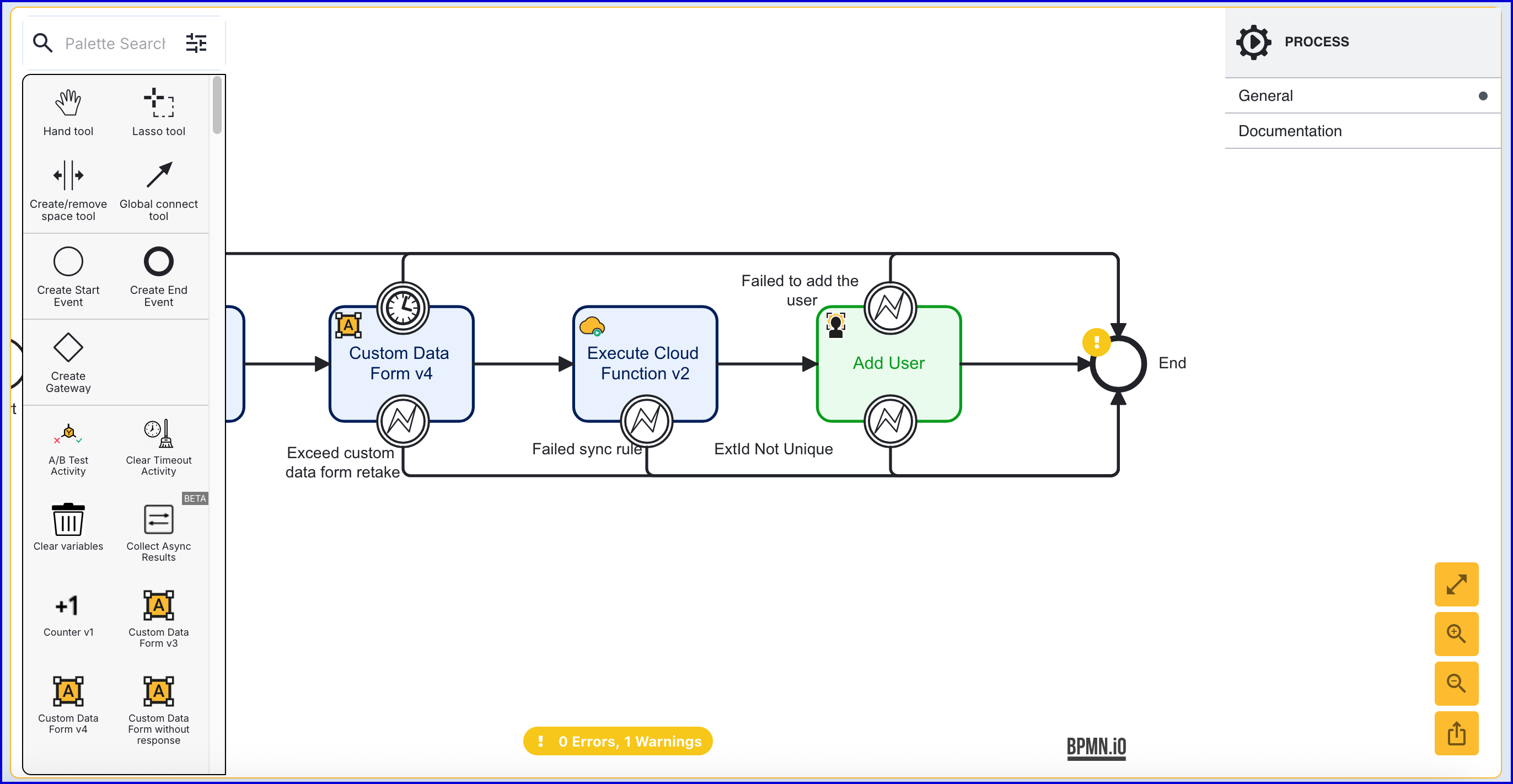 The 'Add User' activity includes two error events. In this example, the error events have been connected to the 'End' event.