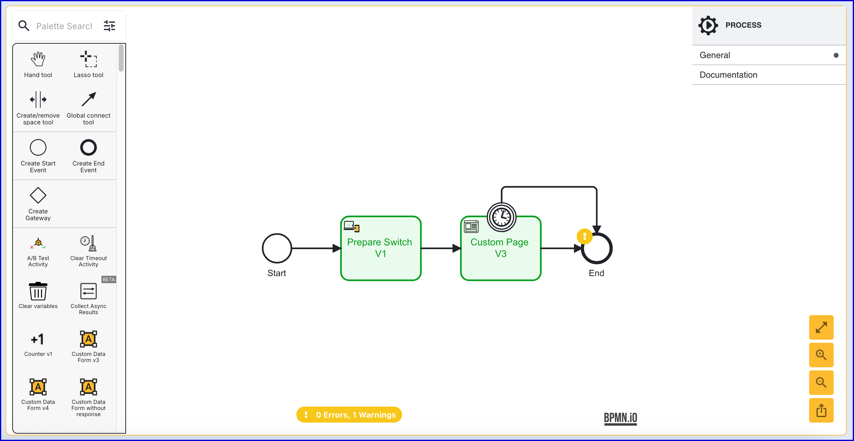 - Add a 'Custom Page V3' activity to the Process Designer and connect it to the 'Prepare Switch V1' activity.