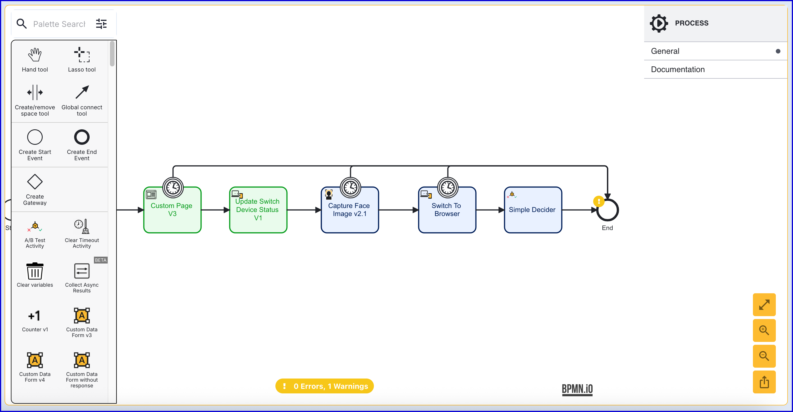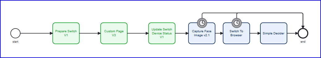 This guide will describe how to implement the following Process Definition that uses a custom page to switch to a mobile device before completing a standard face capture flow.