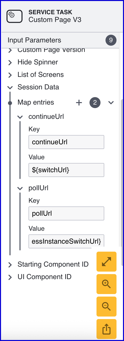 - Under the 'Session Data' input parameter, create two entries for the 'continueUrl' and 'pollUrl'.