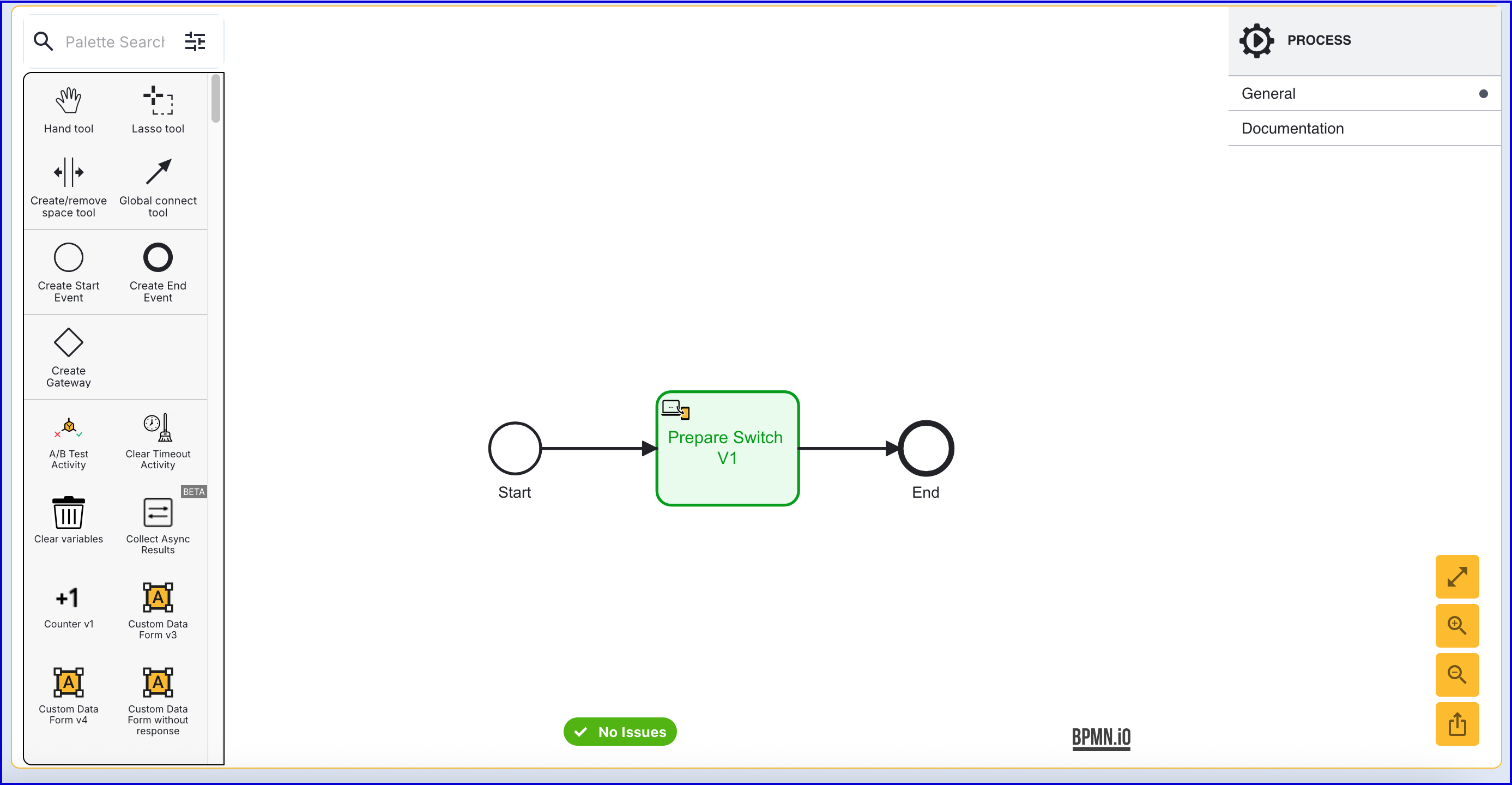 - Add a 'Prepare Switch V1' activity to the Process Designer and use the 'Global connect tool' to link a sequence arrow from the 'Start' event to the new activity.