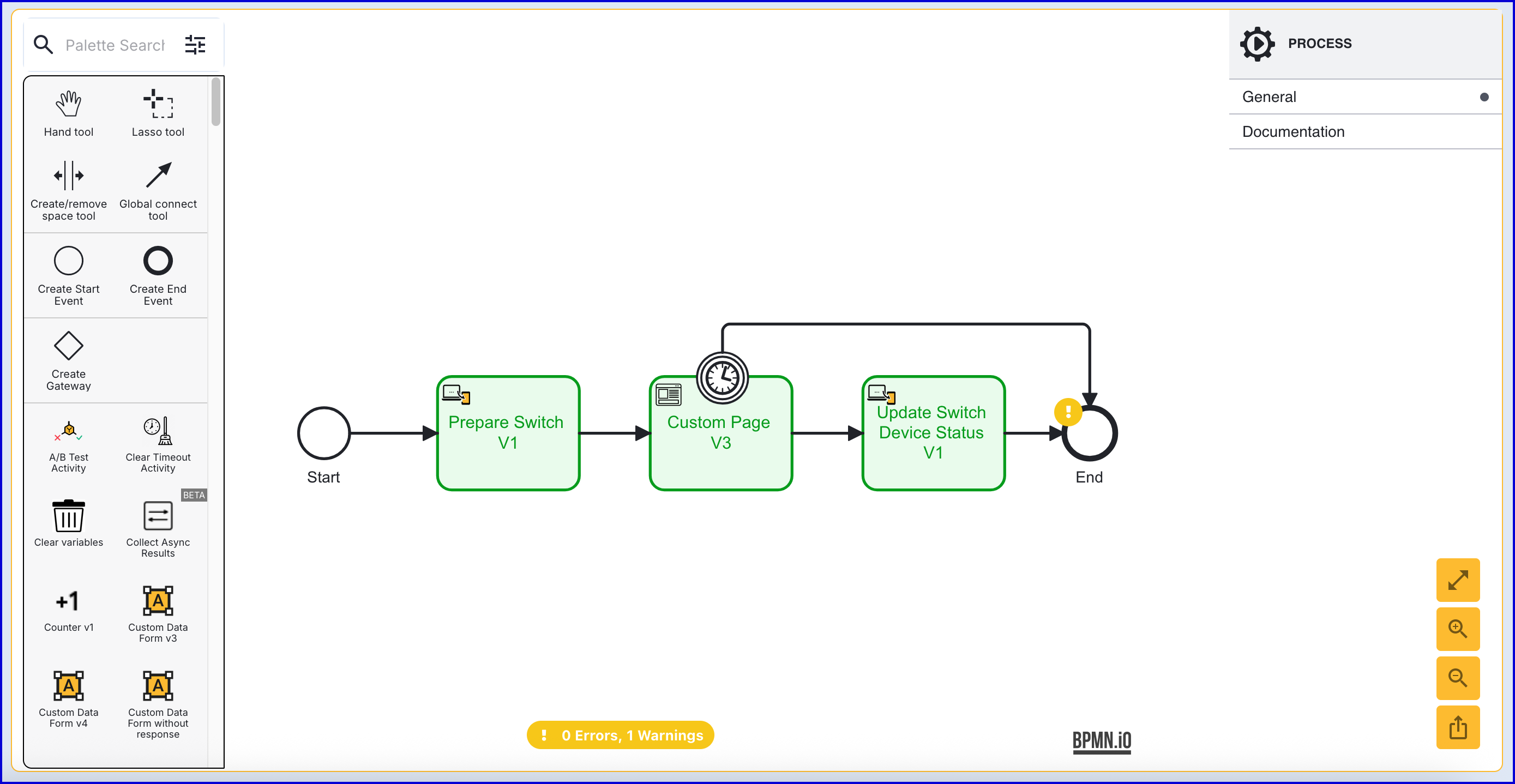 - After the 'Custom Page V3' activity, add the 'Update Switch Device Status V1' activity and connect them using a sequence flow arrow.