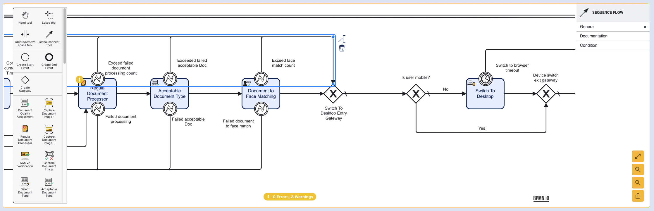 Once the activity is added to the Process Designer, the error gateways must be configured. In the example above, the "Exceed failed fuse results" gateway is connected to the "Switch to Desktop Entry Gateway". In this instance, the end user will have exceeded their max failed attempt and returned to the desktop screen where results of the ID&V flow will be reported.