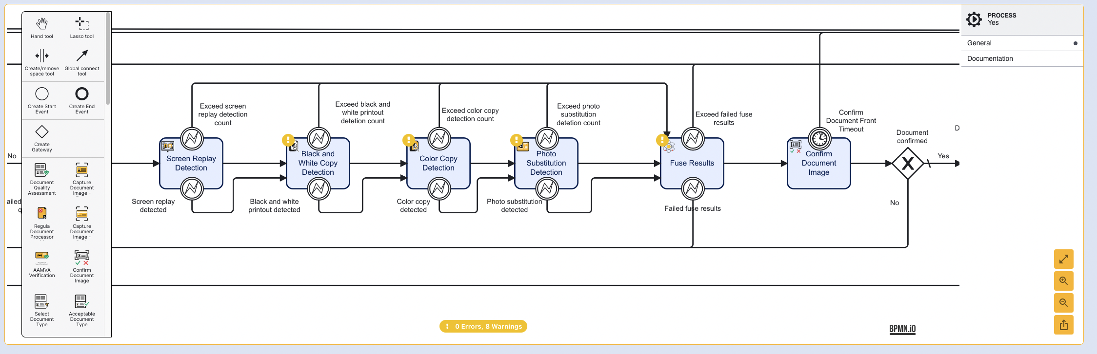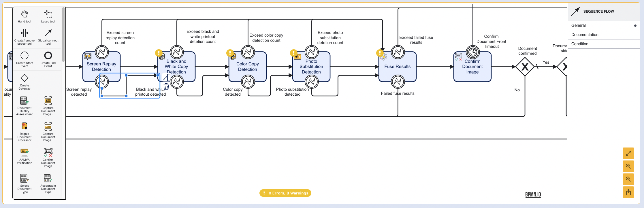Finally, the detected gateways must be connected to the following activity in the ID&V flow. For example, Screen Replay Detected will be connected to Black and White Detected. This will ensure that failed authentication attempts are lead to the Fuse Results activity where the decision to pass or fail authentication is determined.