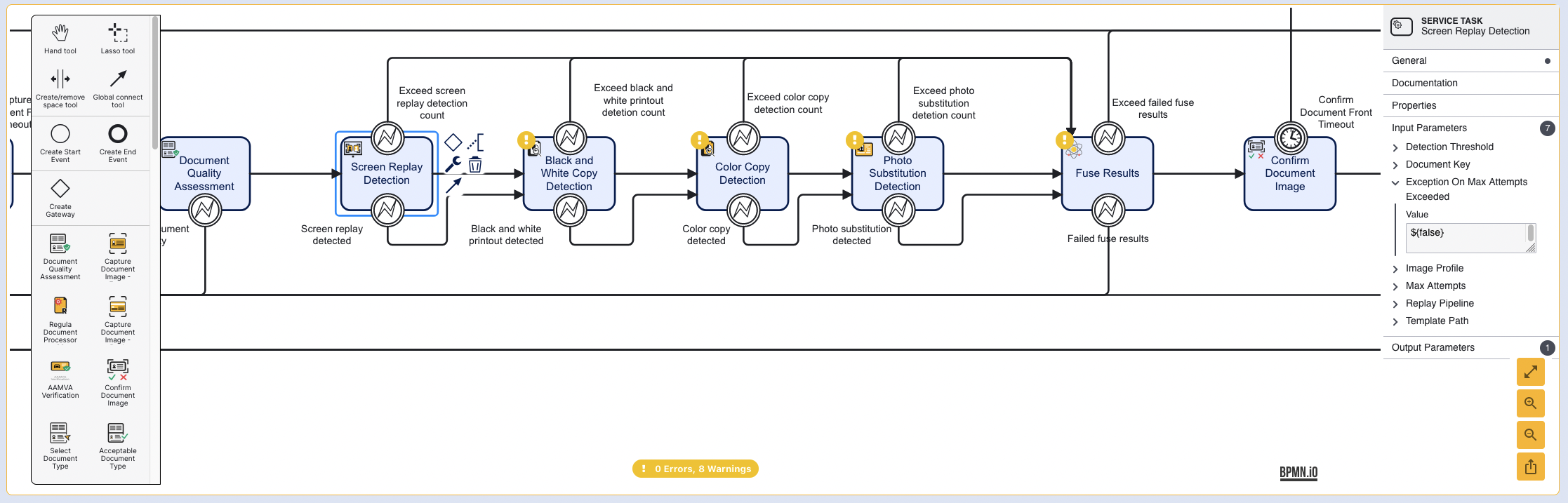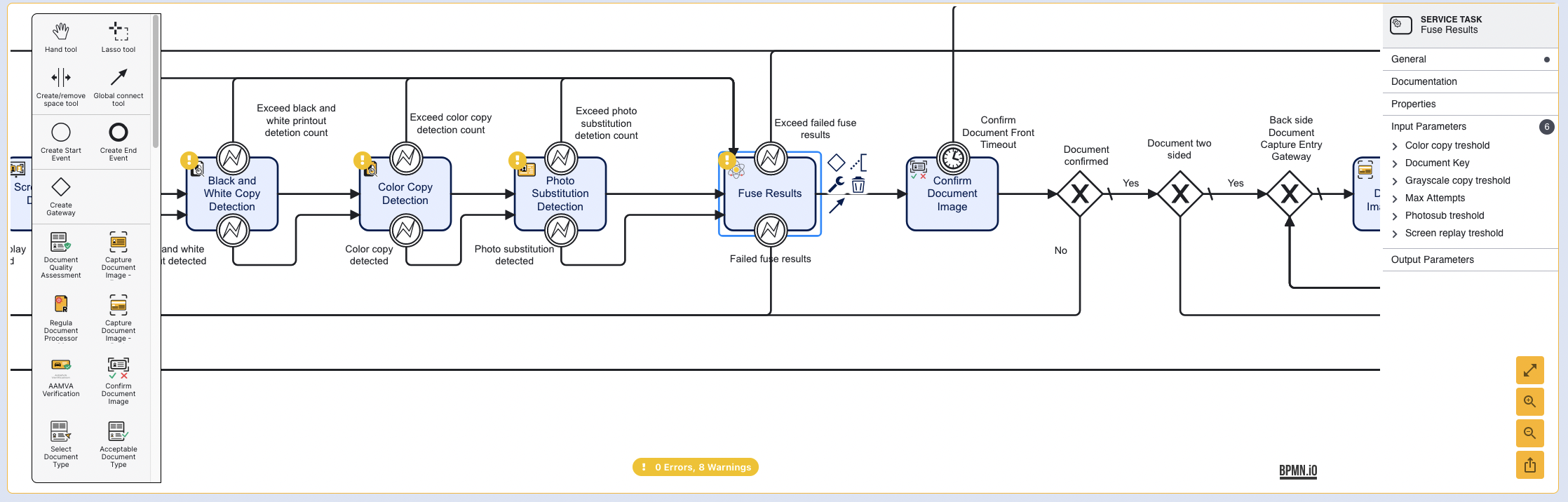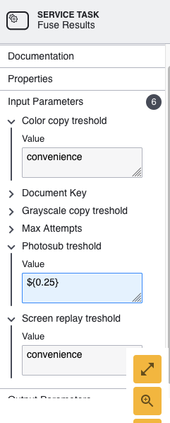 The Fuse Results activity includes input parameters where users can configure thresholds for each document authentication check. It is here that users can also configure the number of max attempts allowed. Select the Fuse Results activity to open the Service Task contextual menu.