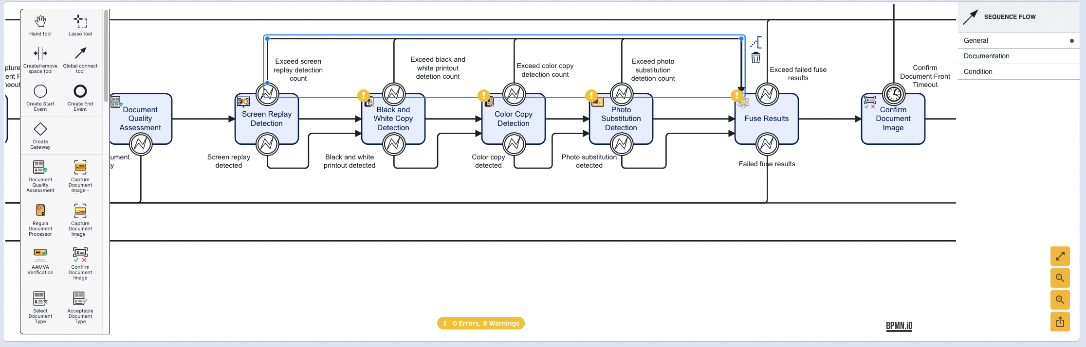 To configure the Process Definition flow to utilize Fusion Results, existing authentication activities - Screen Replay Detection, Black and White Copy Detection, Color Copy Detection, and Photo Substitution Detection will need to be reconfigured to take advantage of the thresholds set in the Fusion Results activity.