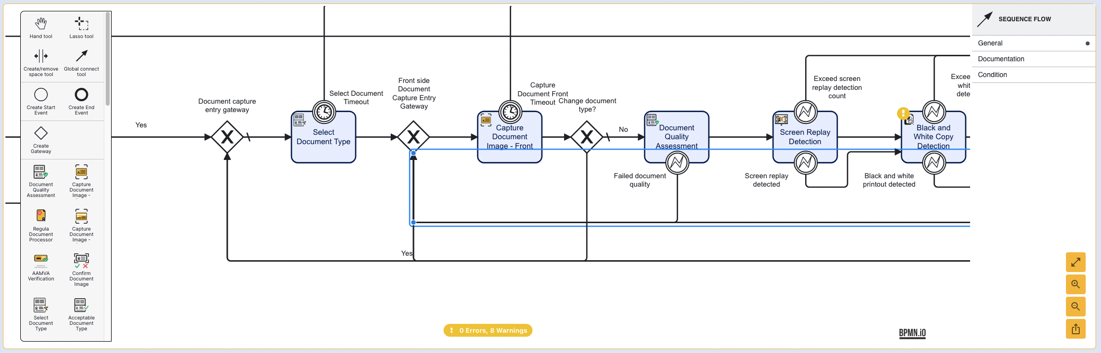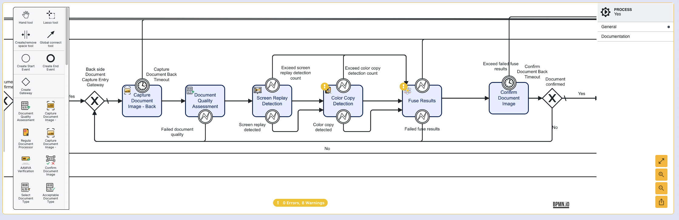 Secondly, the "Failed fuse results" gateway will be configured to connect to the "Front/ Back side document capture entry gateway". This will ensure that failed authentication attempts will return the end user to the document capture activity.