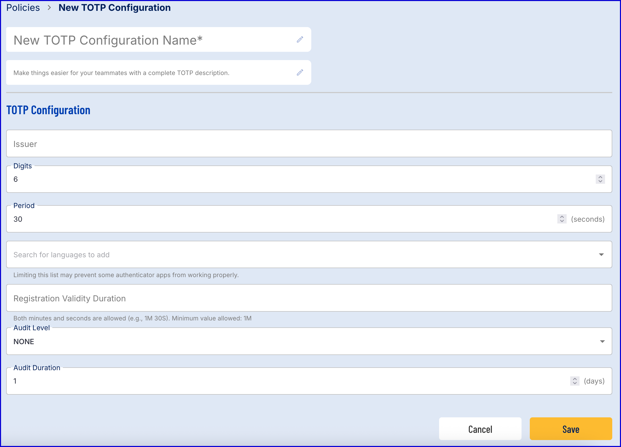 | Audit Level | String | Whether TOTP authentications are audited.