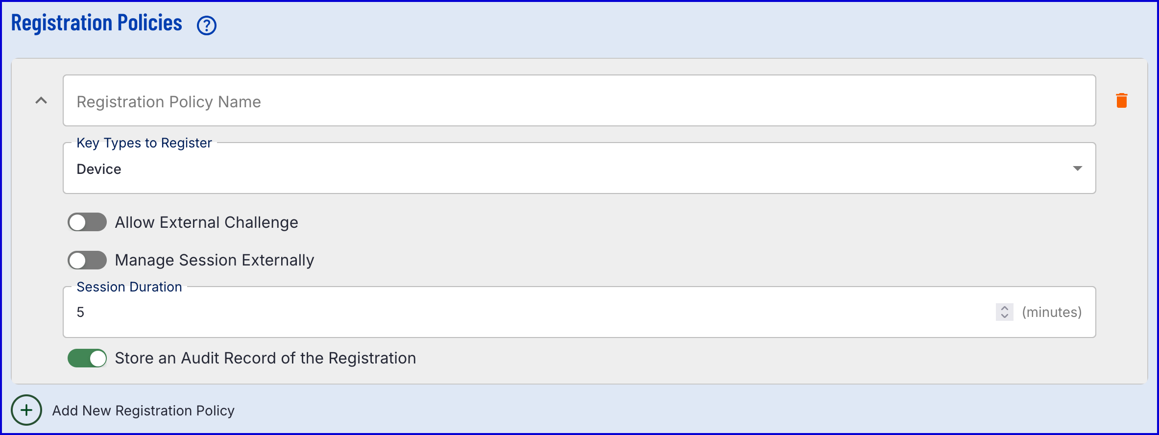 This section enables the configuration of new registration policies. Multiple configurations can be made by clicking the 'Add New Registration Policy' button.