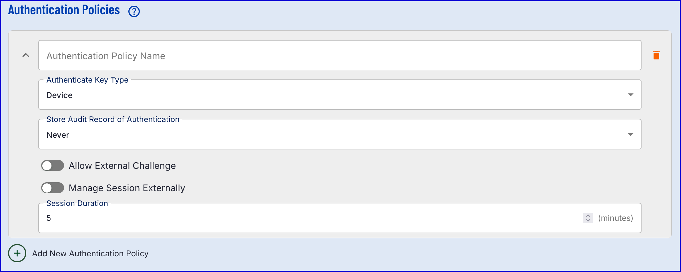 This section enables the configuration of new authentication policies. Multiple configurations can be made by clicking the 'Add New Authentication Policy' button.