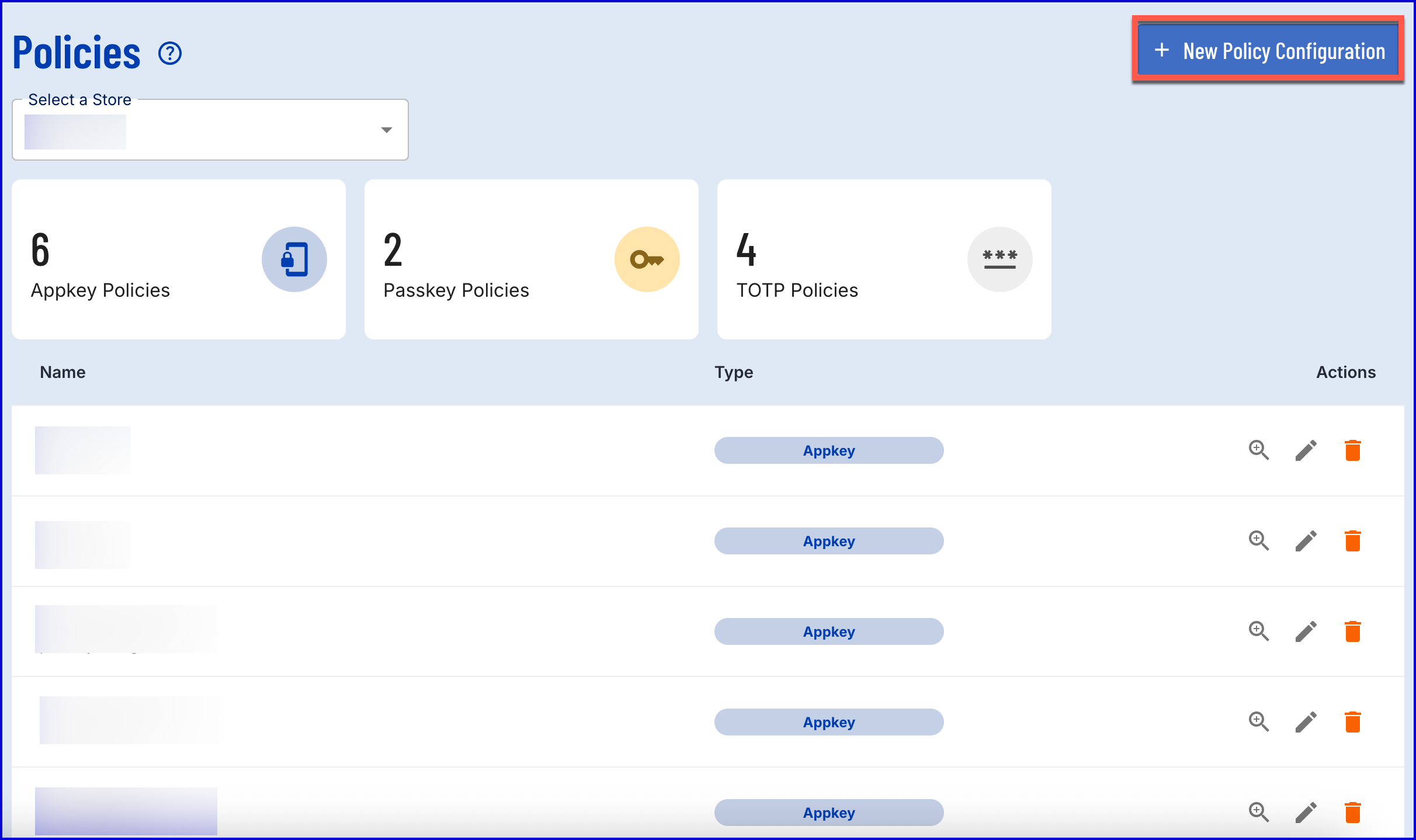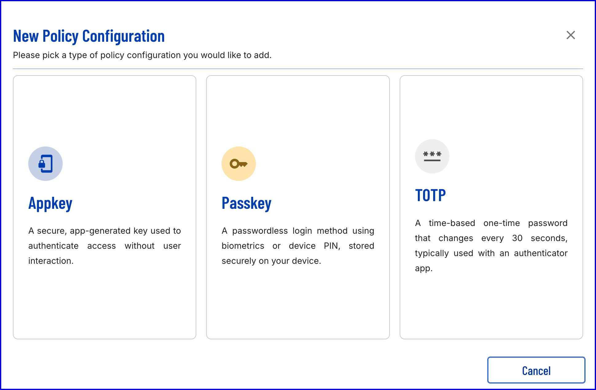 - The 'New Policy Configuration' popup modal will appear where an Appkey, Passkey or TOTP policy can be created.