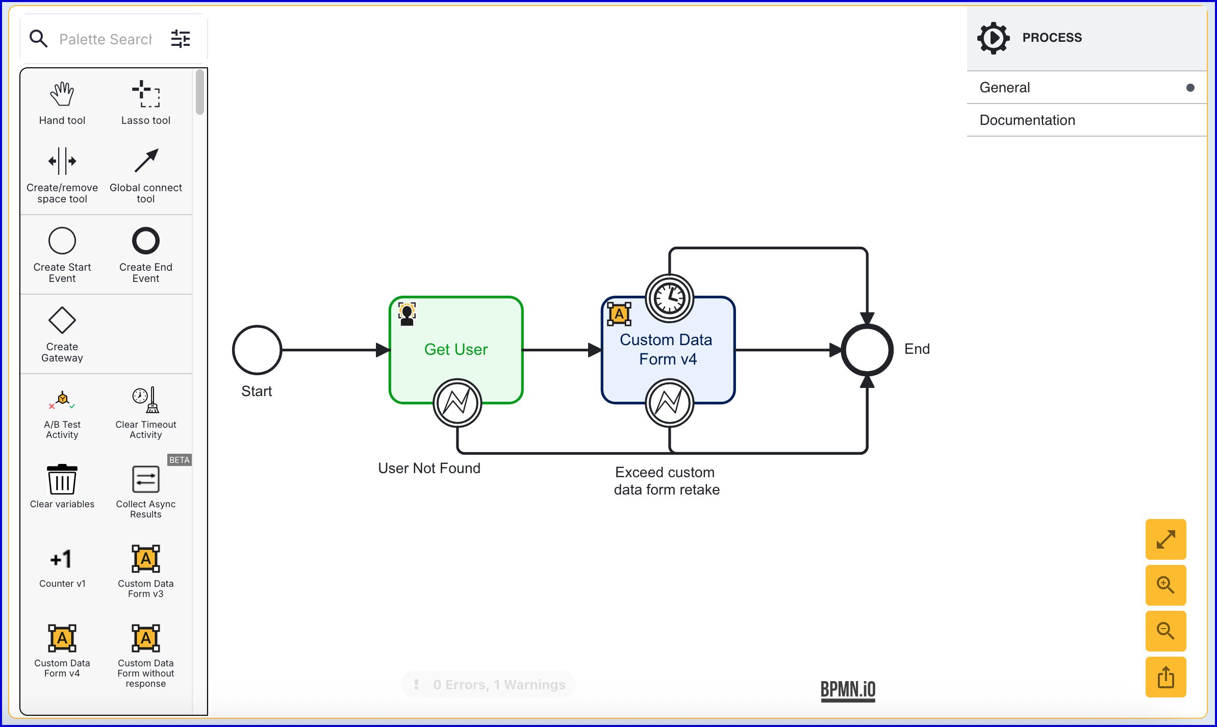 - Add a 'Custom Data Form' activity to the Process Designer and connect it to the 'Get User' application using the global connect tool.