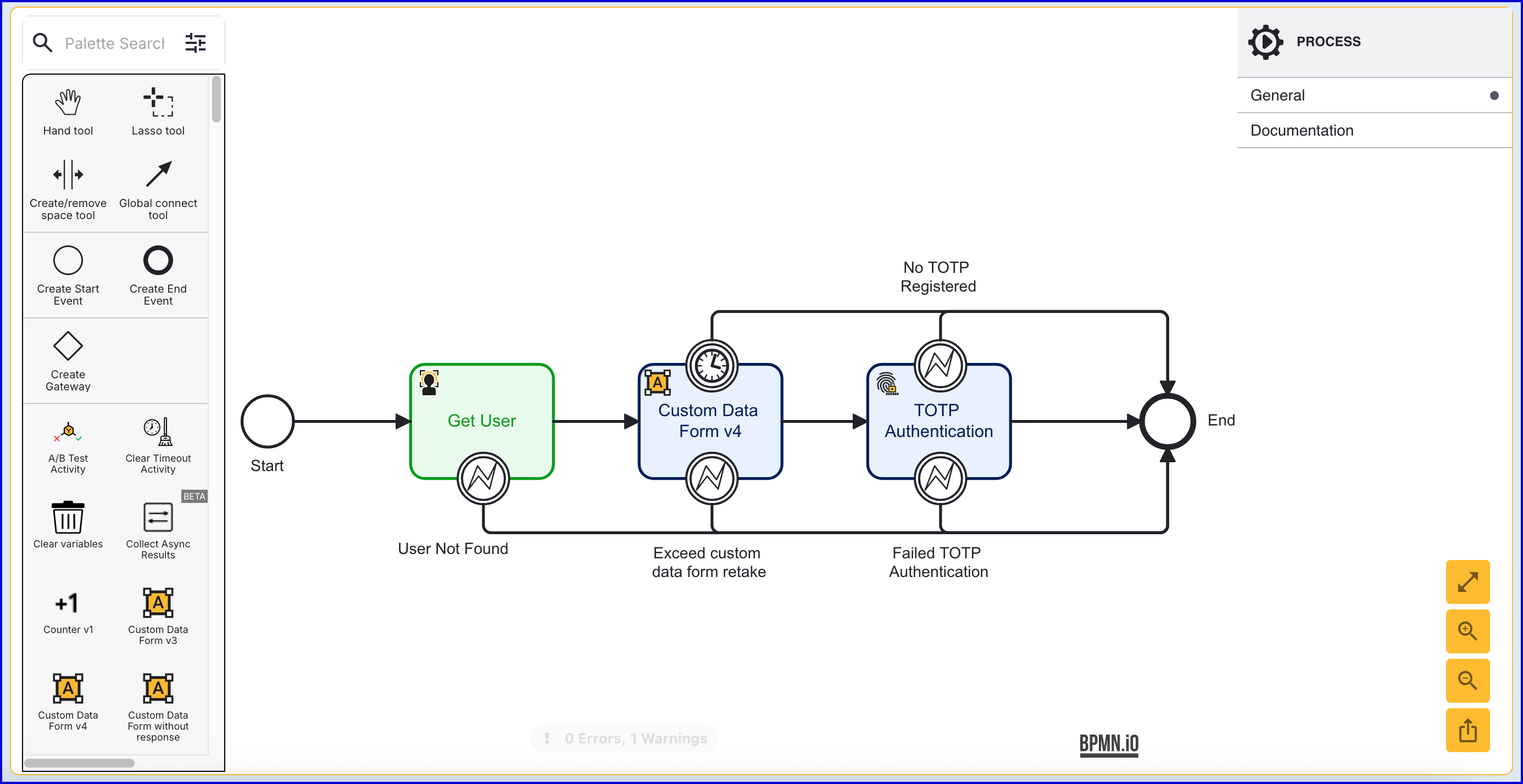 - Add the 'TOTP Authentication' activity to the Process Designer and connect it to the 'Custom Data Form v4' activity.