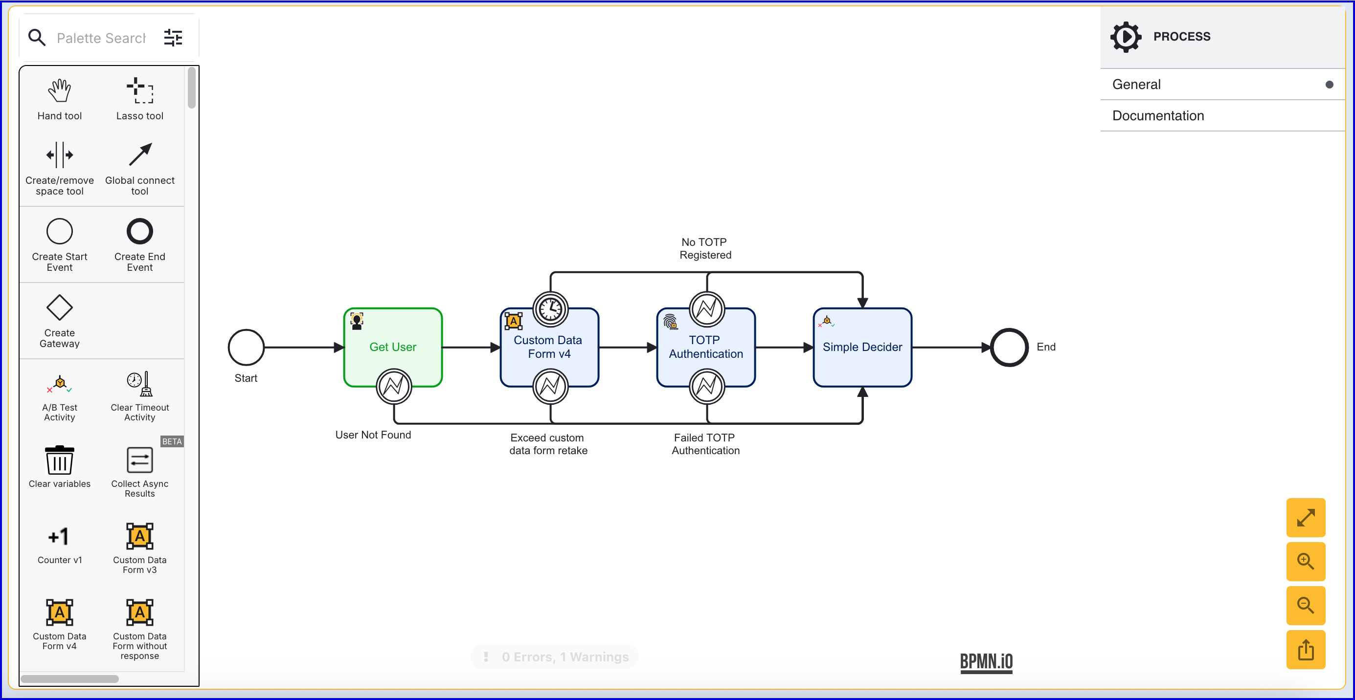 - Add a 'Simple Decider' activity to the Process Definition and connect it to the 'TOTP Authentication'. This activity will set the decision of the Process Instance based on the outcome of the TOTP authentication attempt.