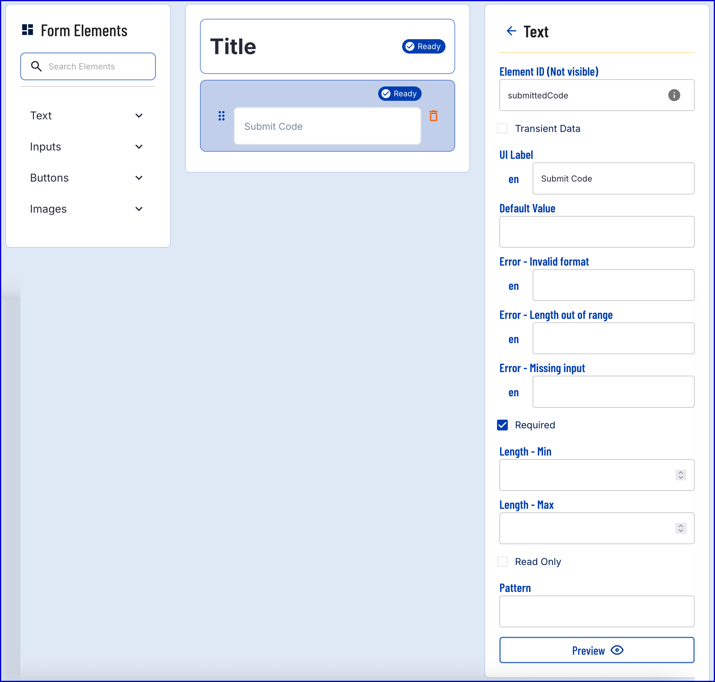 - In this example, the Element ID is set to 'submittedCode'. This value will be required later when accessing the submitted form data.