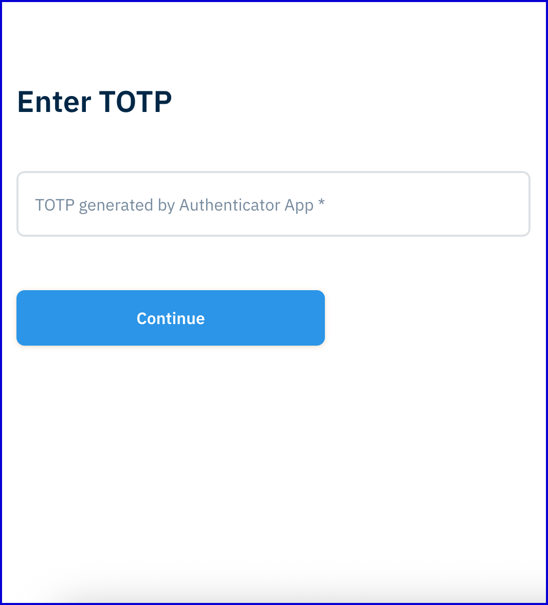 The TOTP Authentication process involves retrieving the Identity Store User before requesting they enter the generated TOTP from their authentication application. TrustX will then perform an authentication request to determine if the secret key stored in TrustX matches the secret key stored on the user's device. This is is similar to the process of completing a registration but requires an active TOTP registration first.