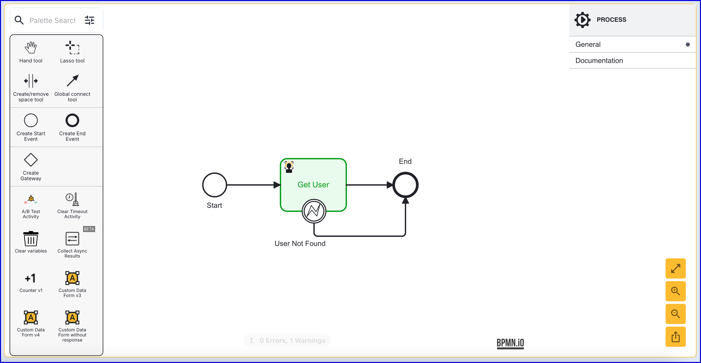 - Add a 'Get User' activity to the Process Designer and connect it to the 'start' event using the global connect tool.