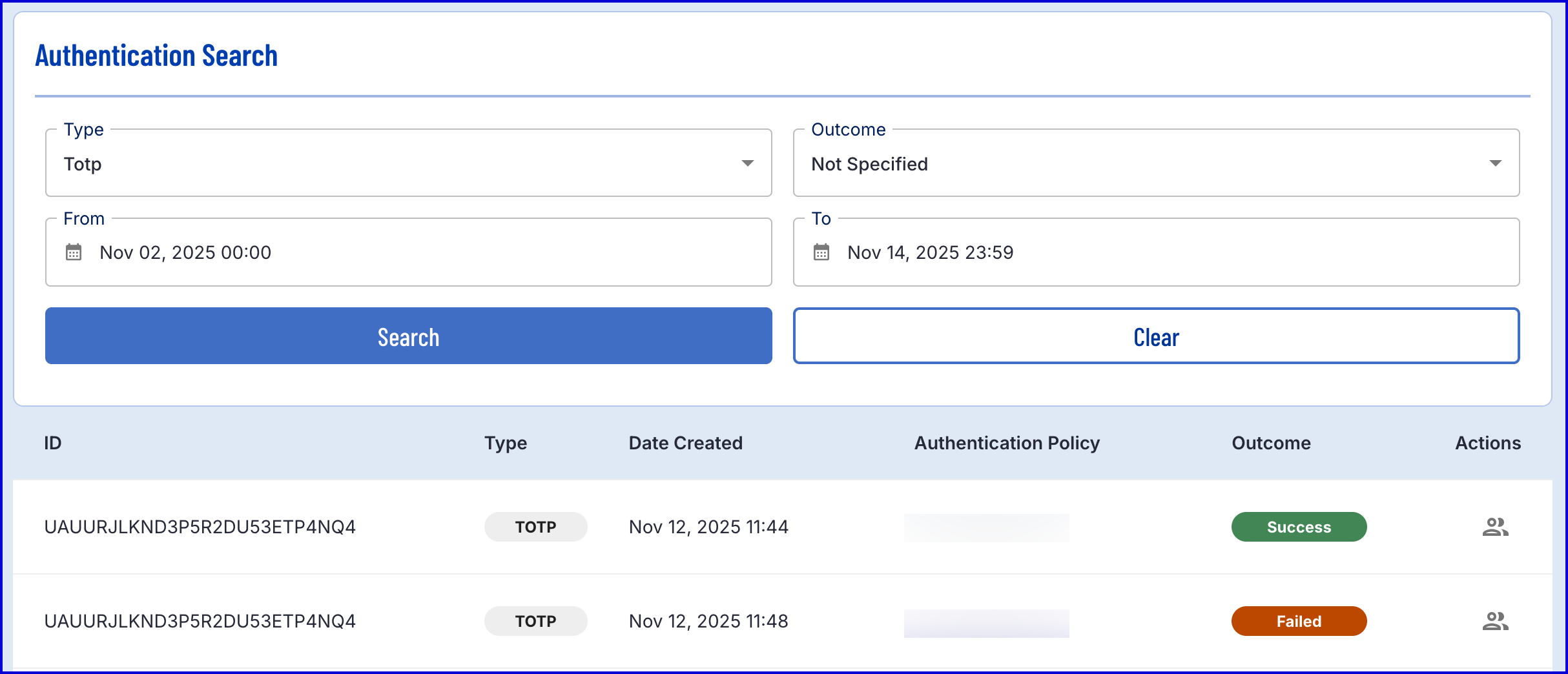 - Under the Authentications section of the Users page, select 'Totp' and click 'Search' to view recent authentication attempts.