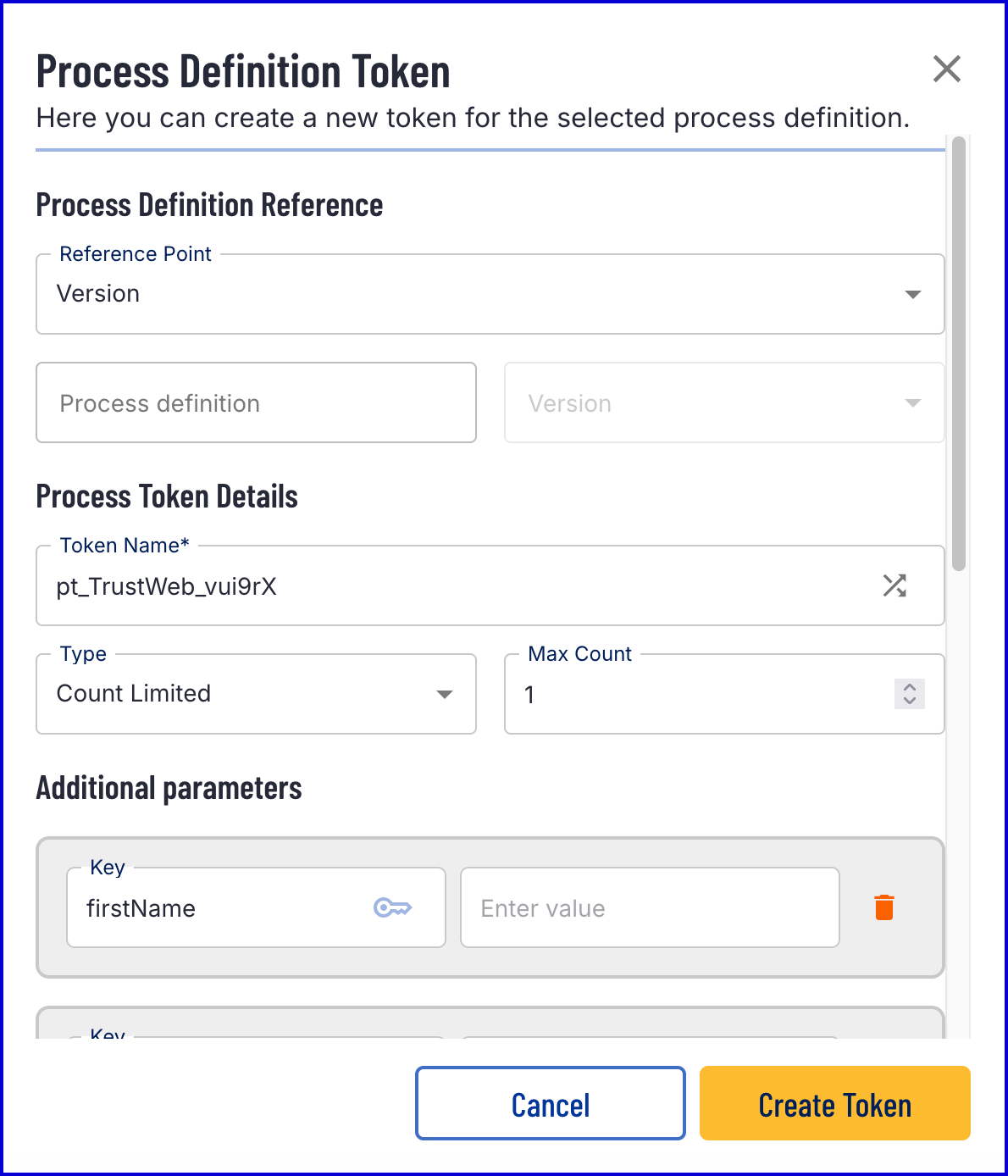 - Click the 'New Process Token' button found on the top-right of the page to start creating a new token. A popup modal will appear where details of the token can be entered.