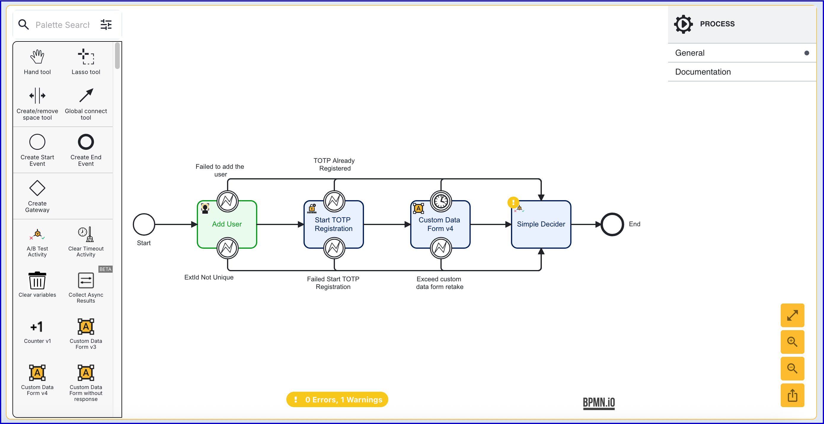 - Add a 'Simple Decider' activity to the Process Definition and connect it to the 'Complete TOTP Registration'. This activity will set the decision of the Process Instance based on the outcome of the TOTP registration attempt.