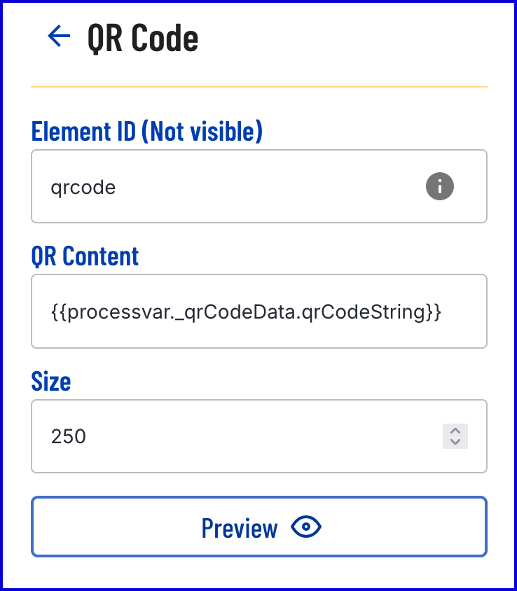 {{processVar._qrCodeData.qrCodeString}}. This string can be understood as follows:- processVar - Access the process variables table. This contains variable data generated during the Process Instance.
