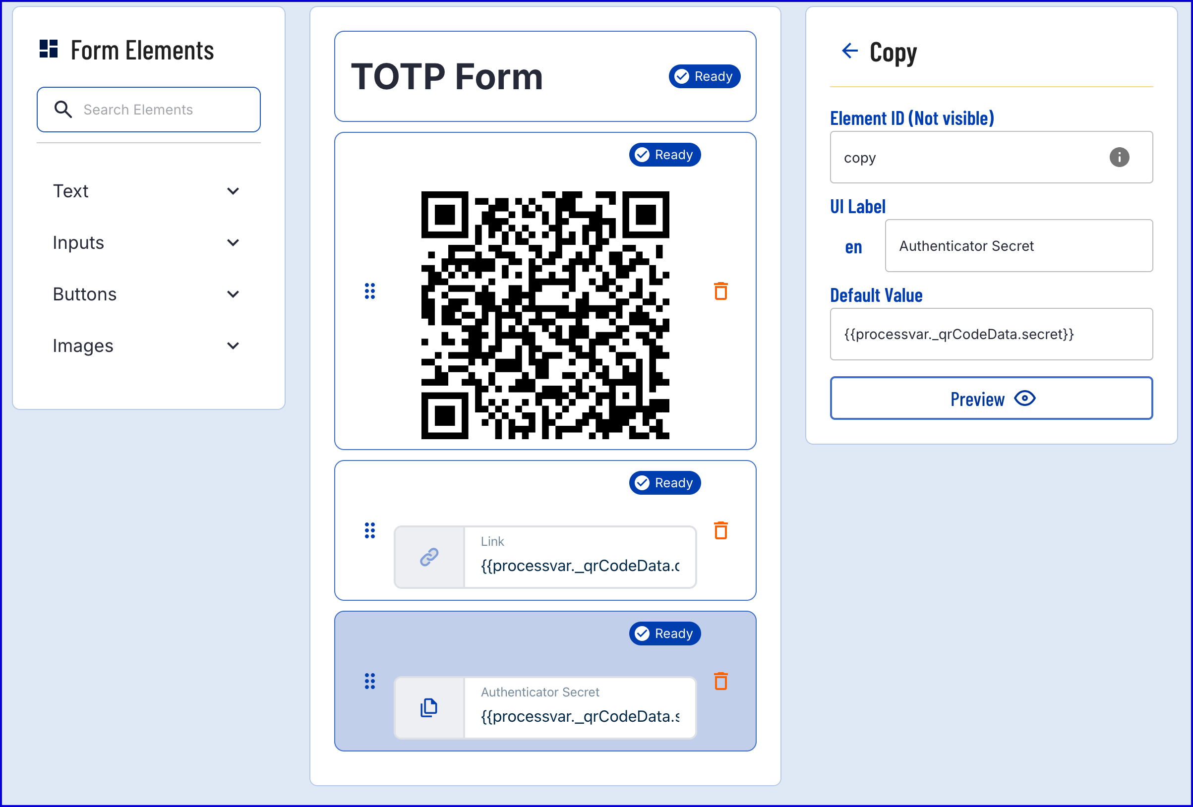 {{processVar._qrCodeData.qrCodeString}}value. When the link is clicked, the user's default authenticator application will open to register the TOTP password. - Add a 'Copy' form element found under the 'Buttons' dropdown list.