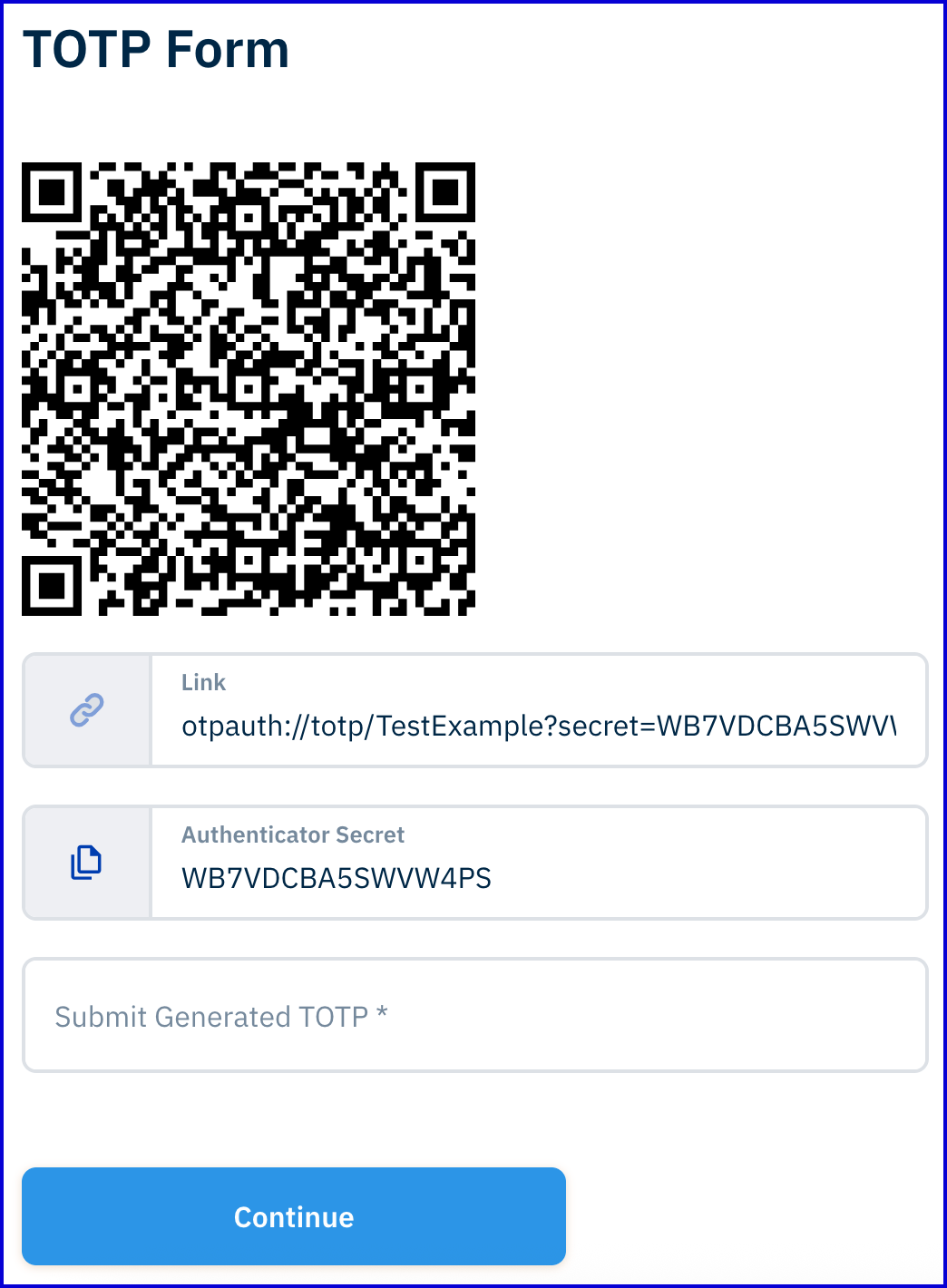 - Once the token is created, scan the QR code or follow the link to begin the flow. The TOTP form will be displayed, enabling the user to scan the QR code and submit the generated TOTP.