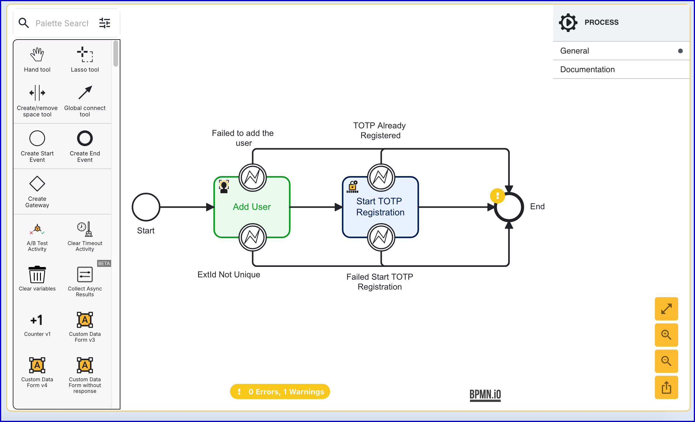 - Add the 'Start TOTP Registration' activity to the Process Designer and connect the activity to the 'Add User' activity using the global connect tool.