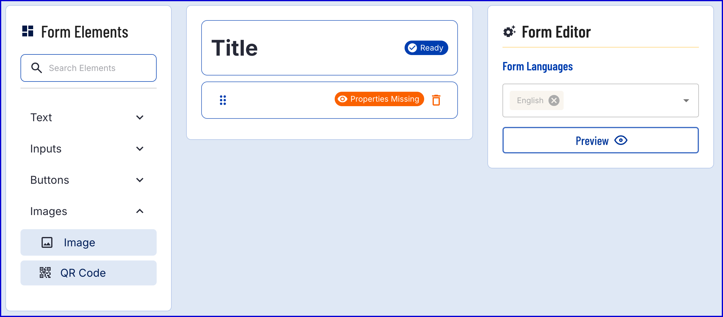 - The new form element will be added beneath the title and will display a "Properties Missing" error. To resolve this, click on the element to open the configuration settings in the Form Editor section.