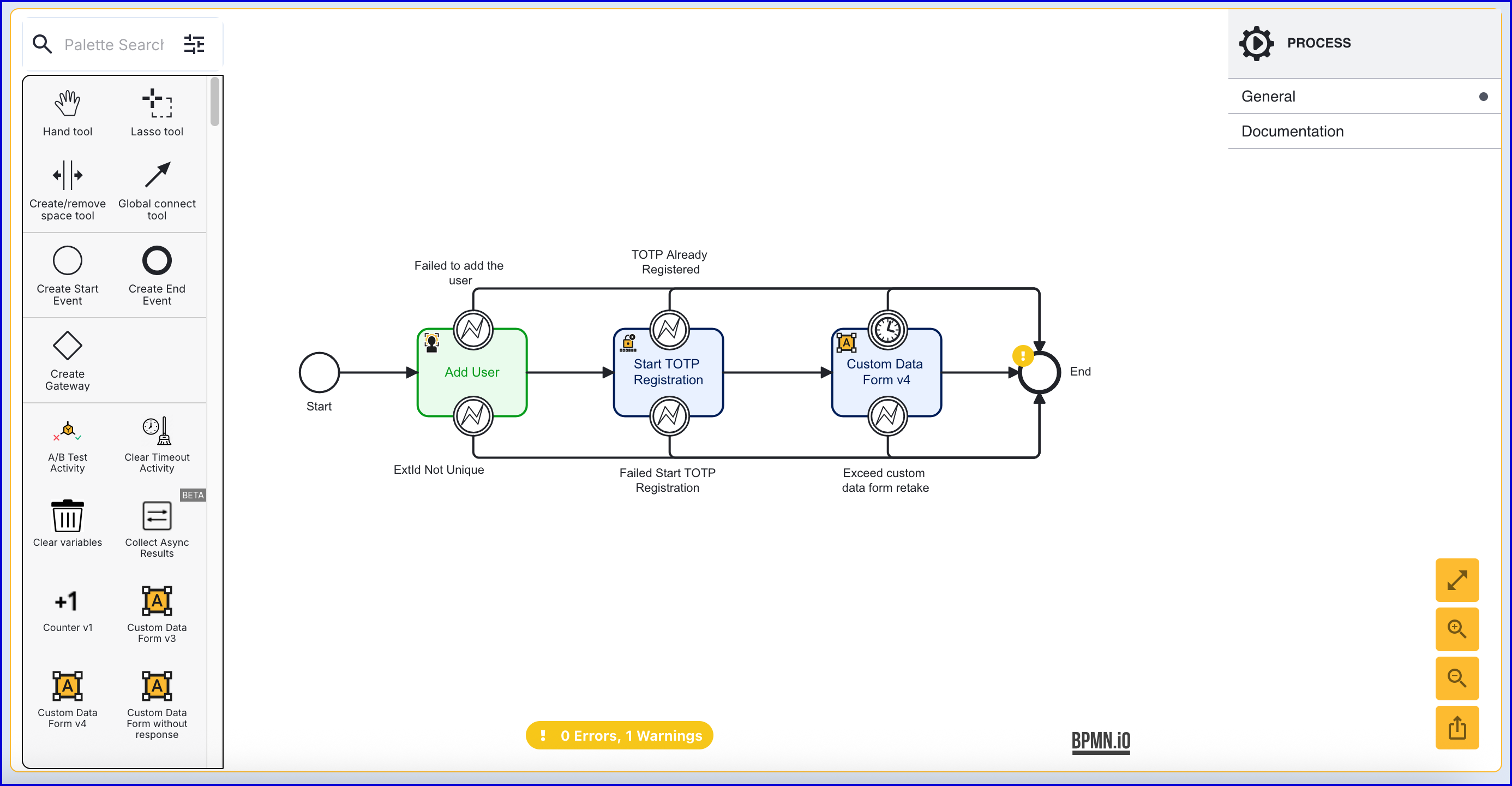 The 'Add User' activity includes two error events. In this example, the error events have been connected to the 'End' event.