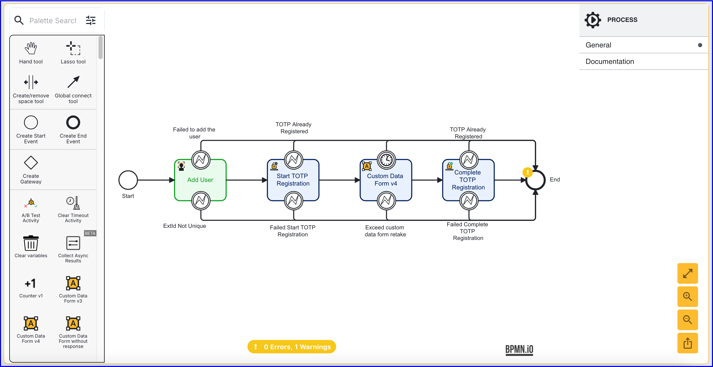 - After the 'Custom Data Form v4' activity, add a 'Complete TOTP Registration' activity and use the global connect tool to connect them. This activity will perform an initial authentication and complete the registration process.