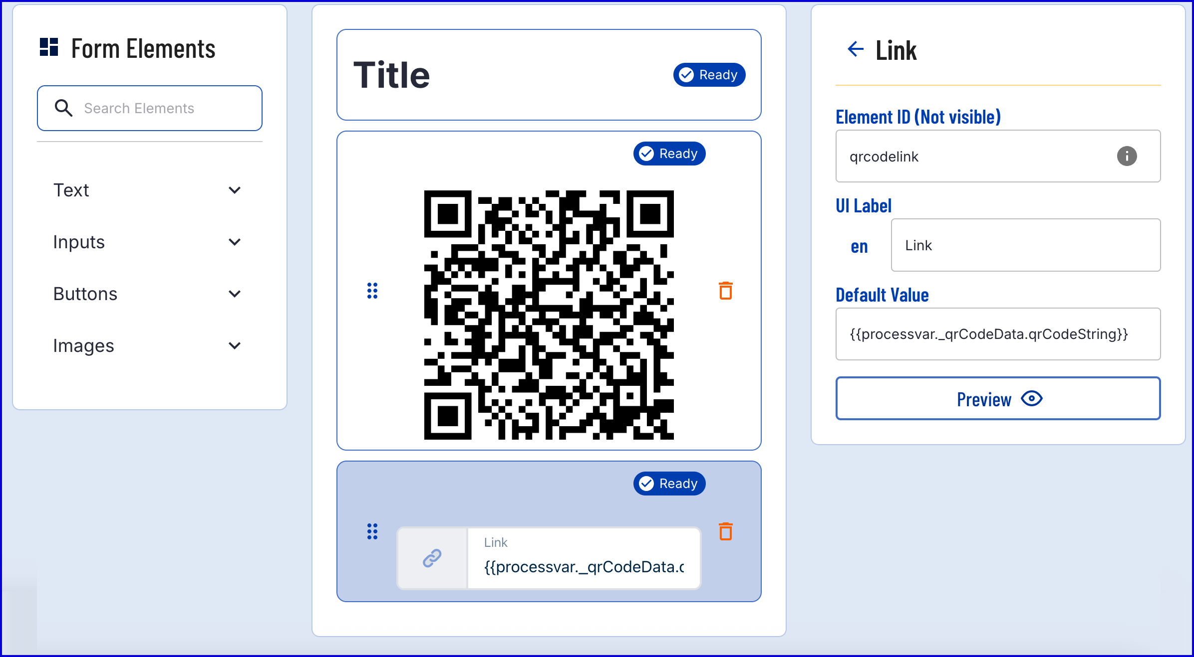Once the QR Code form element is defined, add a 'Link' form element, found under the 'Buttons' dropdown list.