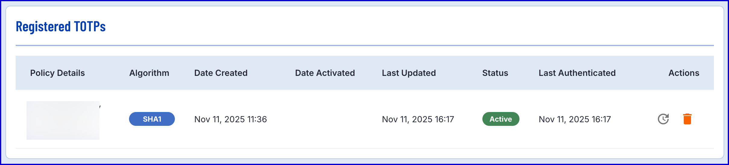 - In the individual Users page, details about the registration can be found in the 'Registered TOTPs' section.