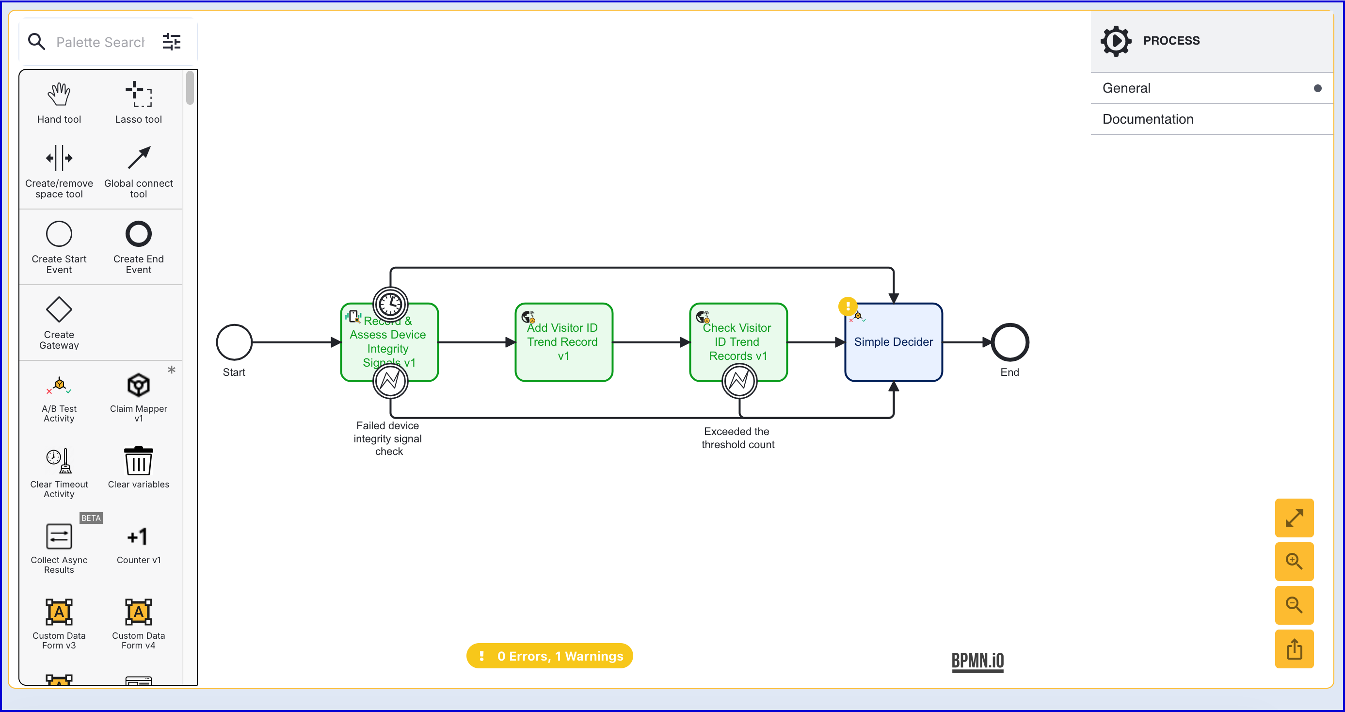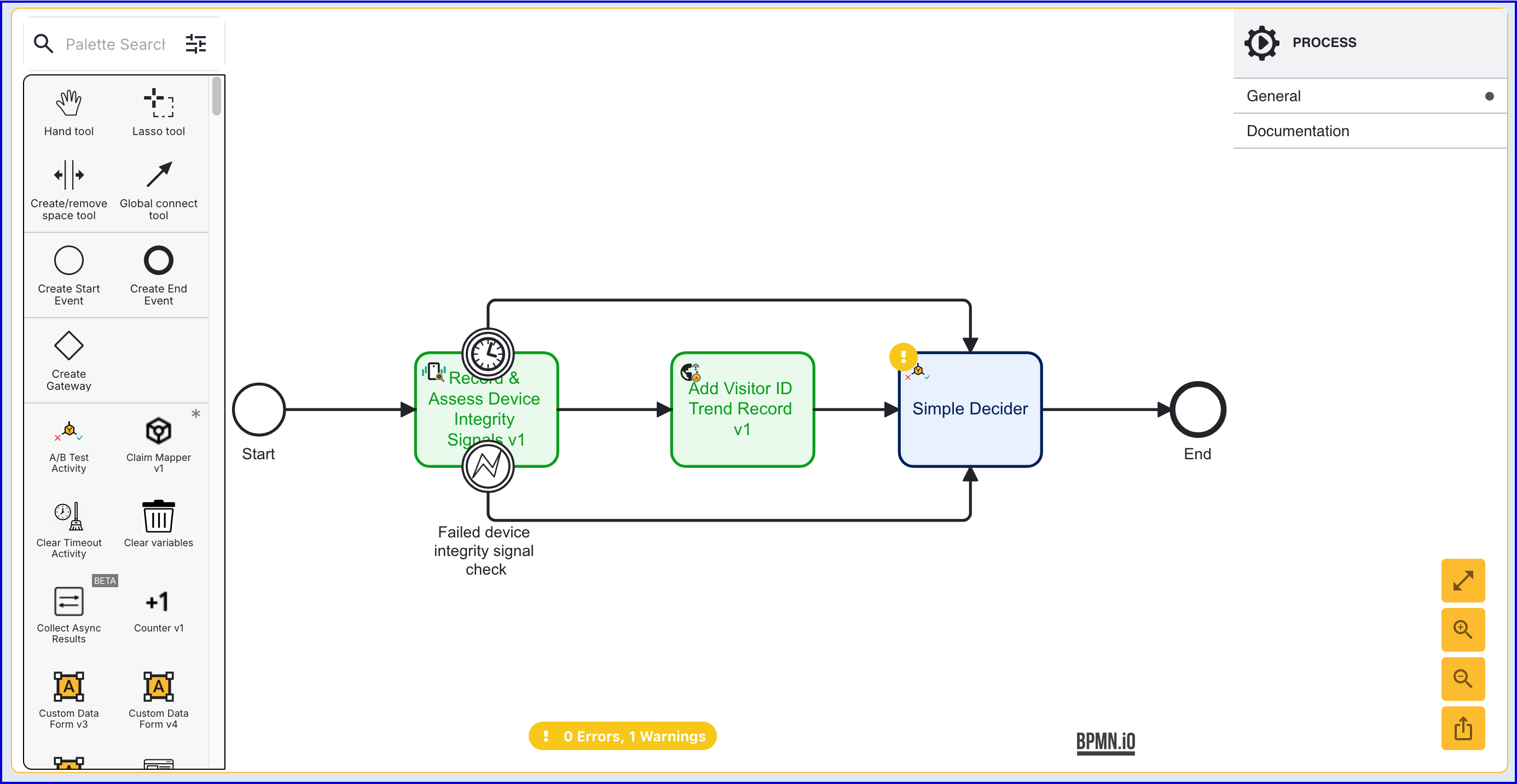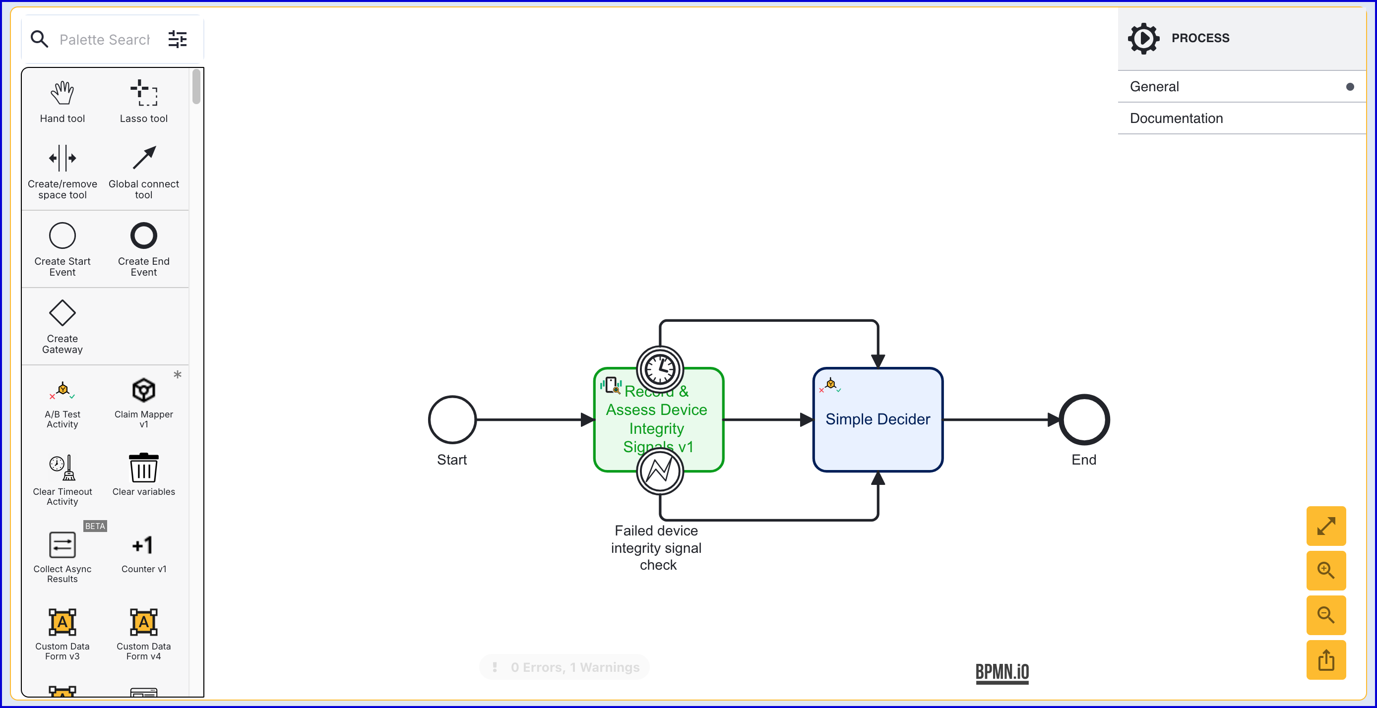 - In the Process Designer, add a 'Record & Assess Device Integrity Signals' activity and connect it to the 'Start' event using 'Global connect tool'.