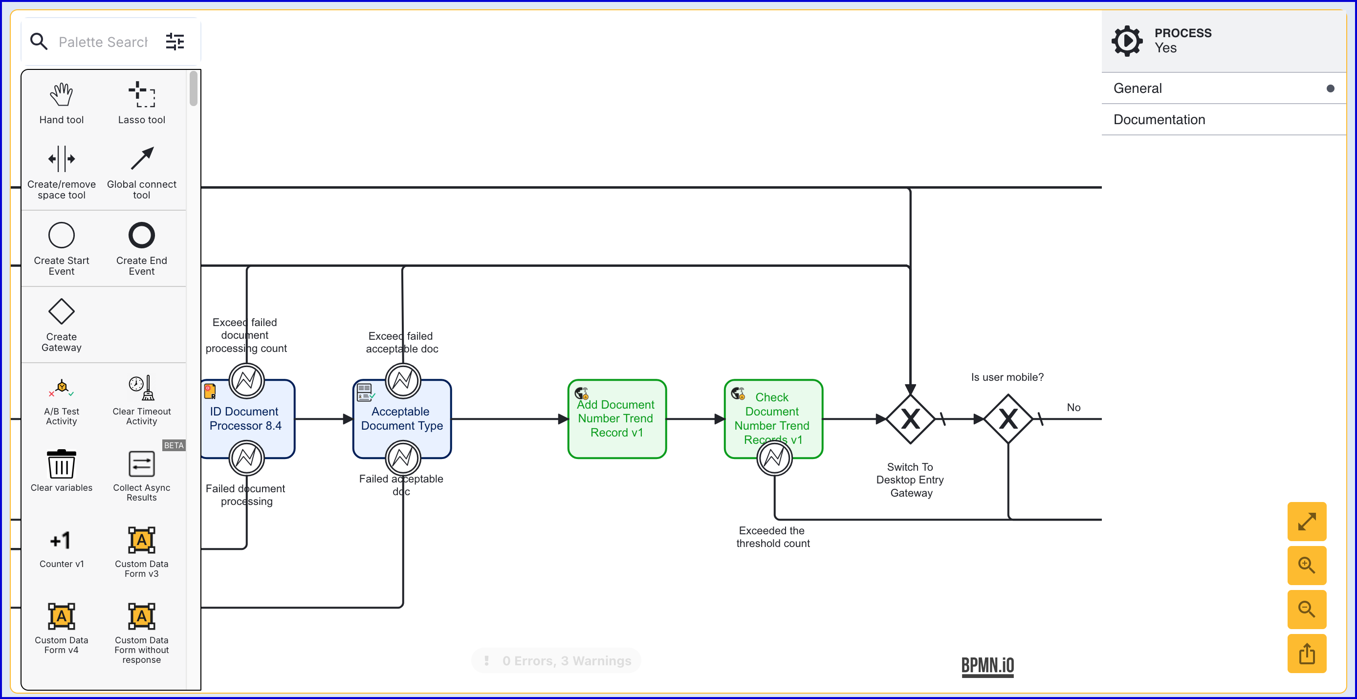 - This activity also features an 'Exceed the threshold count' error boundary event. This is triggered when the value entered in the 'threshold count' input parameter is exceeded.