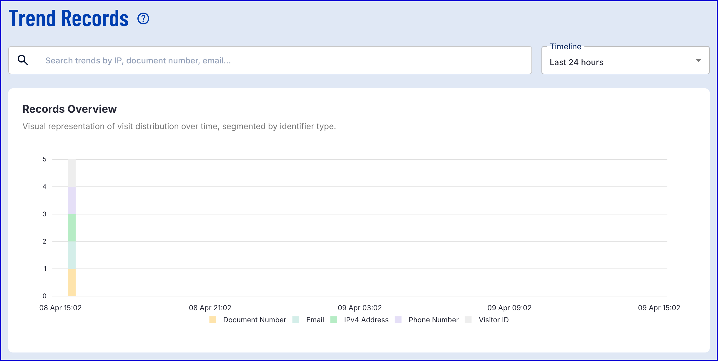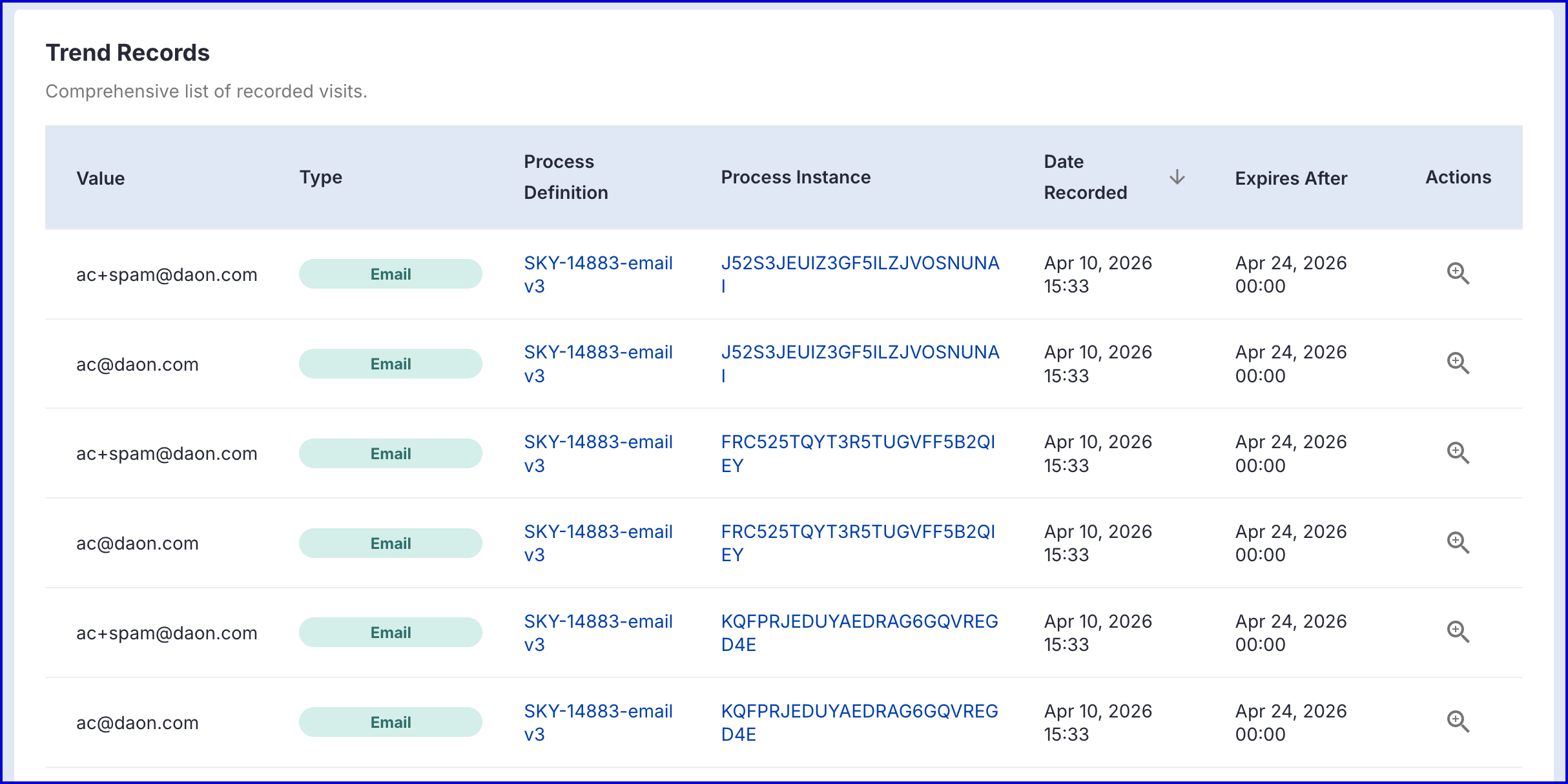 Trend Records collect a record of visitors that have connected to the TrustX system to improve fraud detection and provide trending information about the email, phone-number, document, and IP address typically used by the individual visitor when accessing the system. This is an important factor in fraud detection to measure the actions related to trend patterns. For example, if there are multiple process instances for the same IP address or with the same Visitor ID.