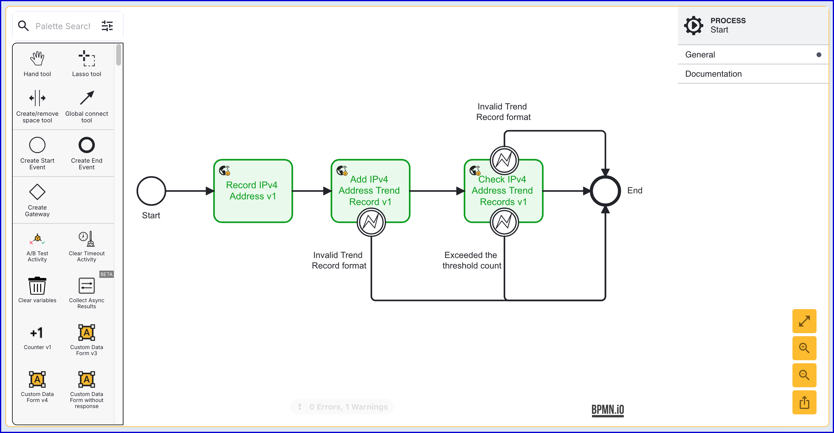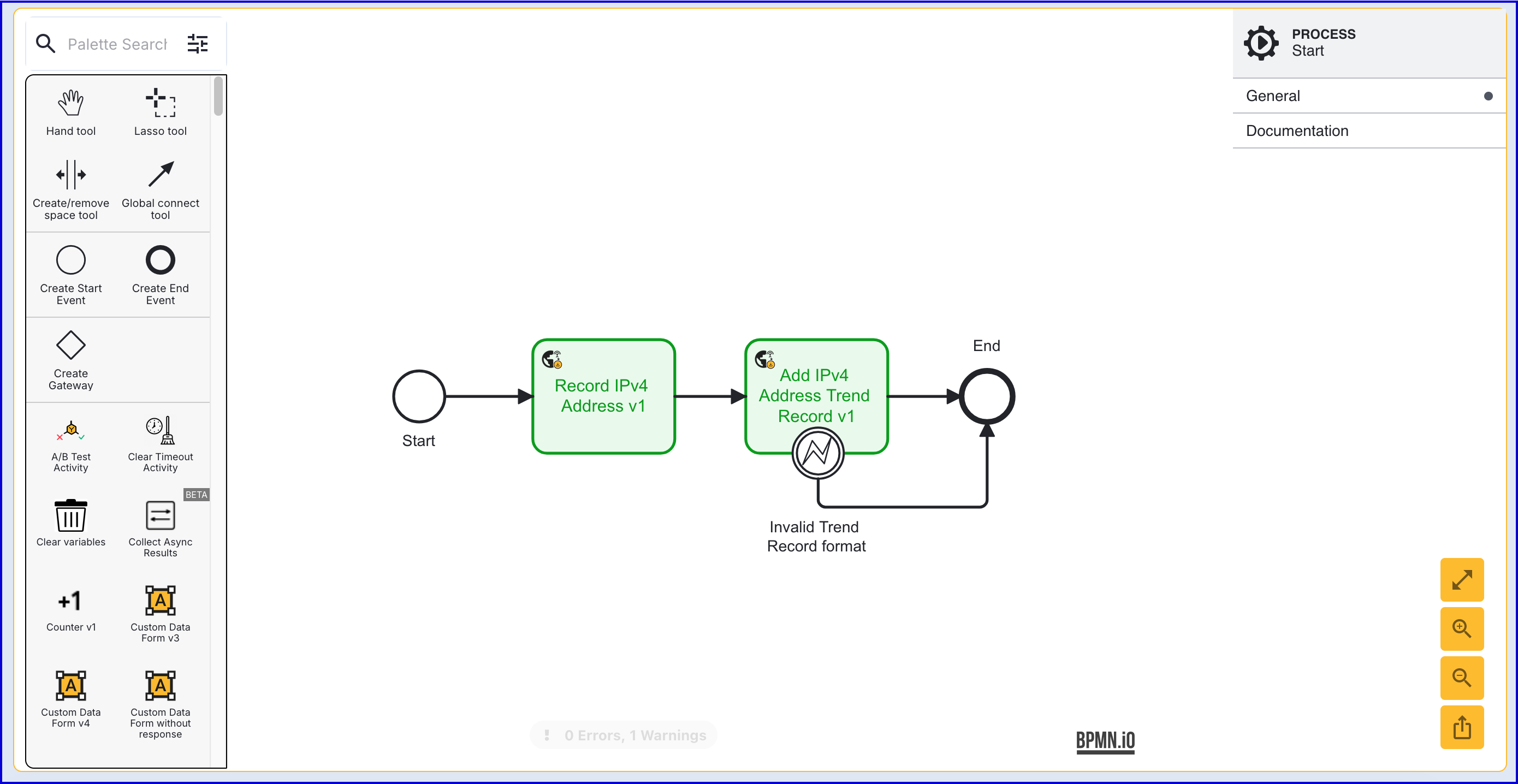 - After the 'Record IPv4' Address activity, add an 'Add IPv4 Address Trend Record' activity to the Process Designer and connect it using the 'Global connect tool'.