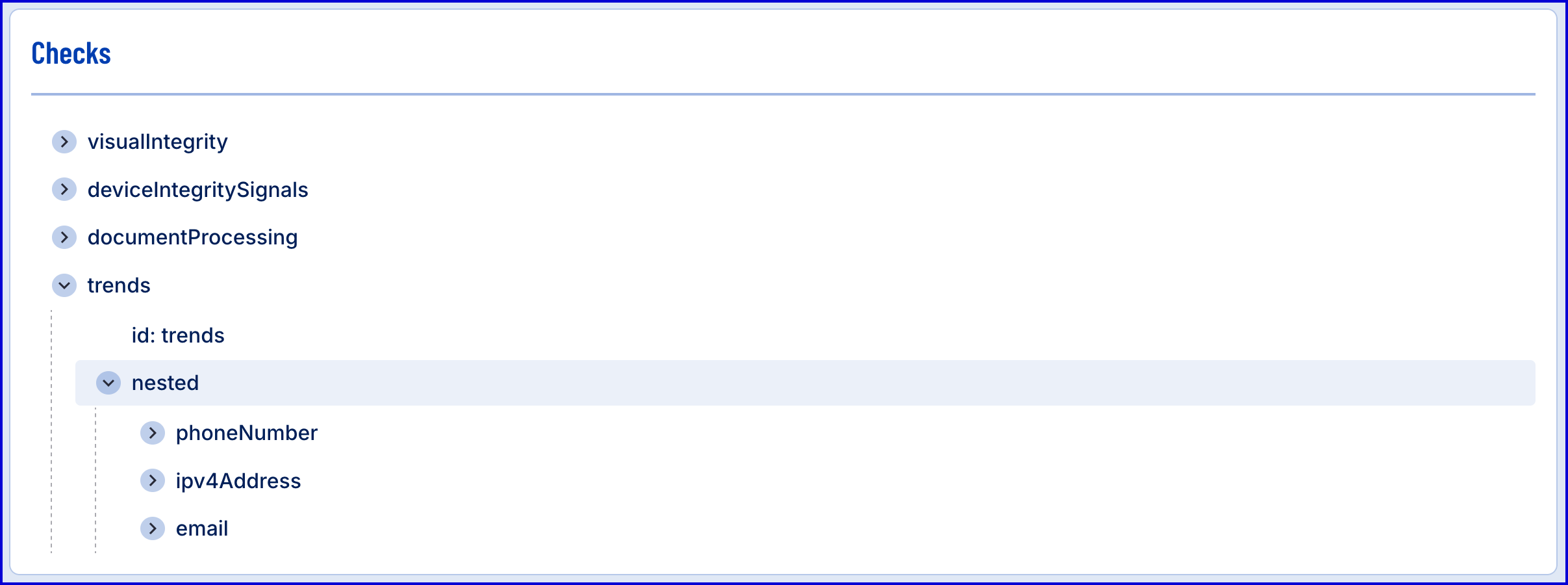 | Check Key | The key under which the check result will be stored in the checks object. | String | Yes | documentNumber1TrendCheck |