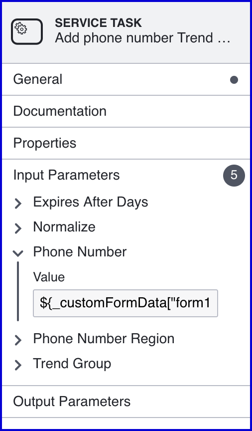 - For the 'Phone Number' input parameter, enter the following to perform variable substitution with data captured from the Custom Data Form: