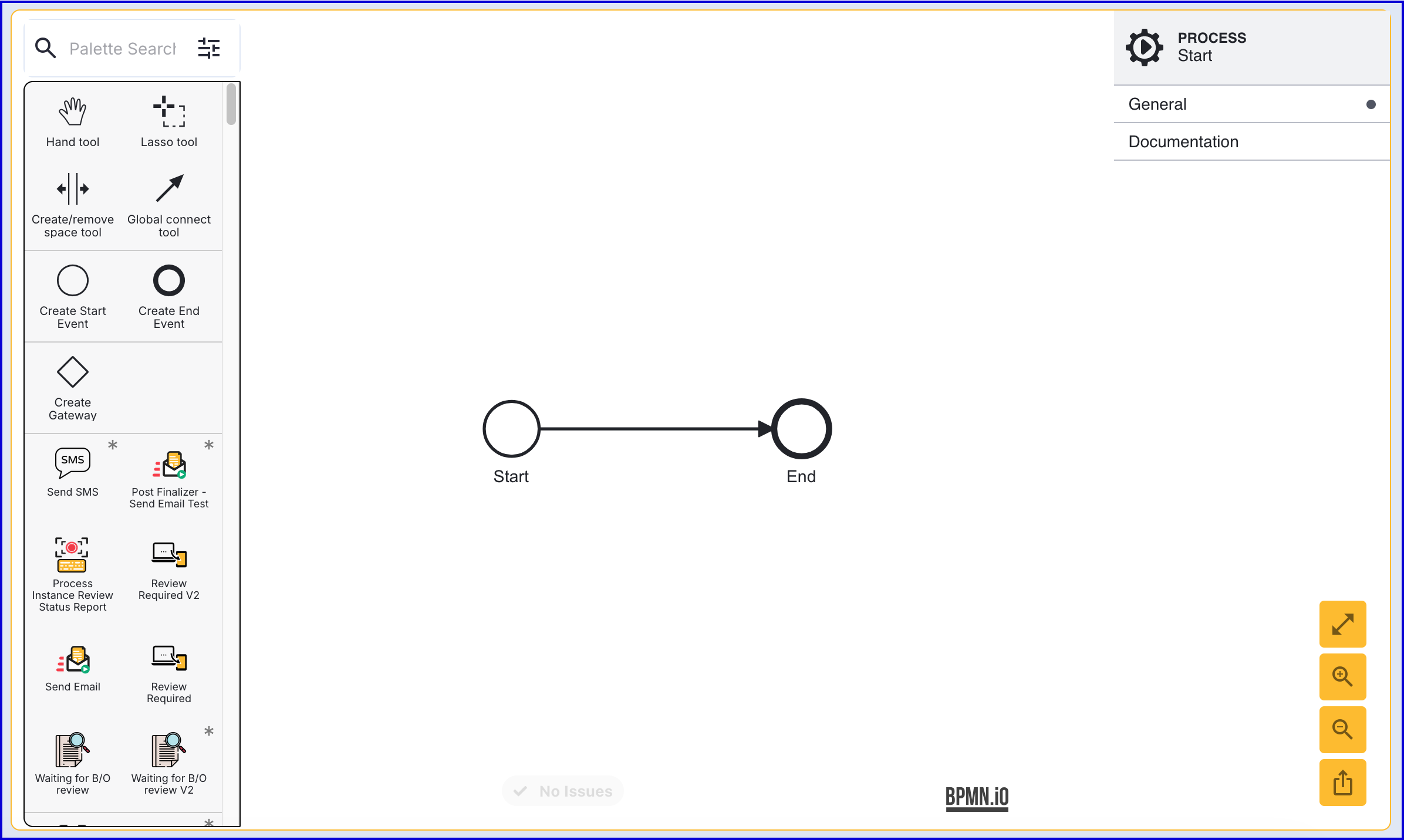 - To get started, add a 'Create Start Event' and and an 'Create End Event' to the Process Designer and join them using Global connect tool.