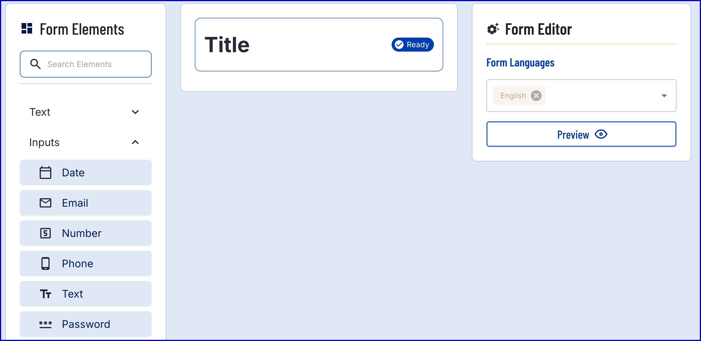 xxxxxxxxxx{ "title": { "values": { "en": "Personal information" }, "isValid": true, "type": "title" }, "components": [ { "type": "email", "isValid": true, "readOnly": false, "id": "email", "label": { "values": { "en": "Email" } }, "default": "", "transient": false, "validate": { "required": false, "pattern": "^[a-zA-Z0-9._%+-]+@[a-zA-Z0-9.-]+.[a-zA-Z]{2,}$", "missingMessage": { "values": { "en": "" } }, "invalidMessage": { "values": { "en": "" } } }, "index": 0 }, { "type": "phone", "isValid": true, "readOnly": false, "id": "phone", "label": { "values": { "en": "Phone number" } }, "default": "", "defaultCountry": "", "validate": { "required": false, "missingMessage": { "values": { "en": "" } }, "invalidMessage": { "values": { "en": "" } } }, "index": 1 } ]}This form includes an 'Email' and 'Phone' form element, which can be found in the Visual Builder under the Inputs category.