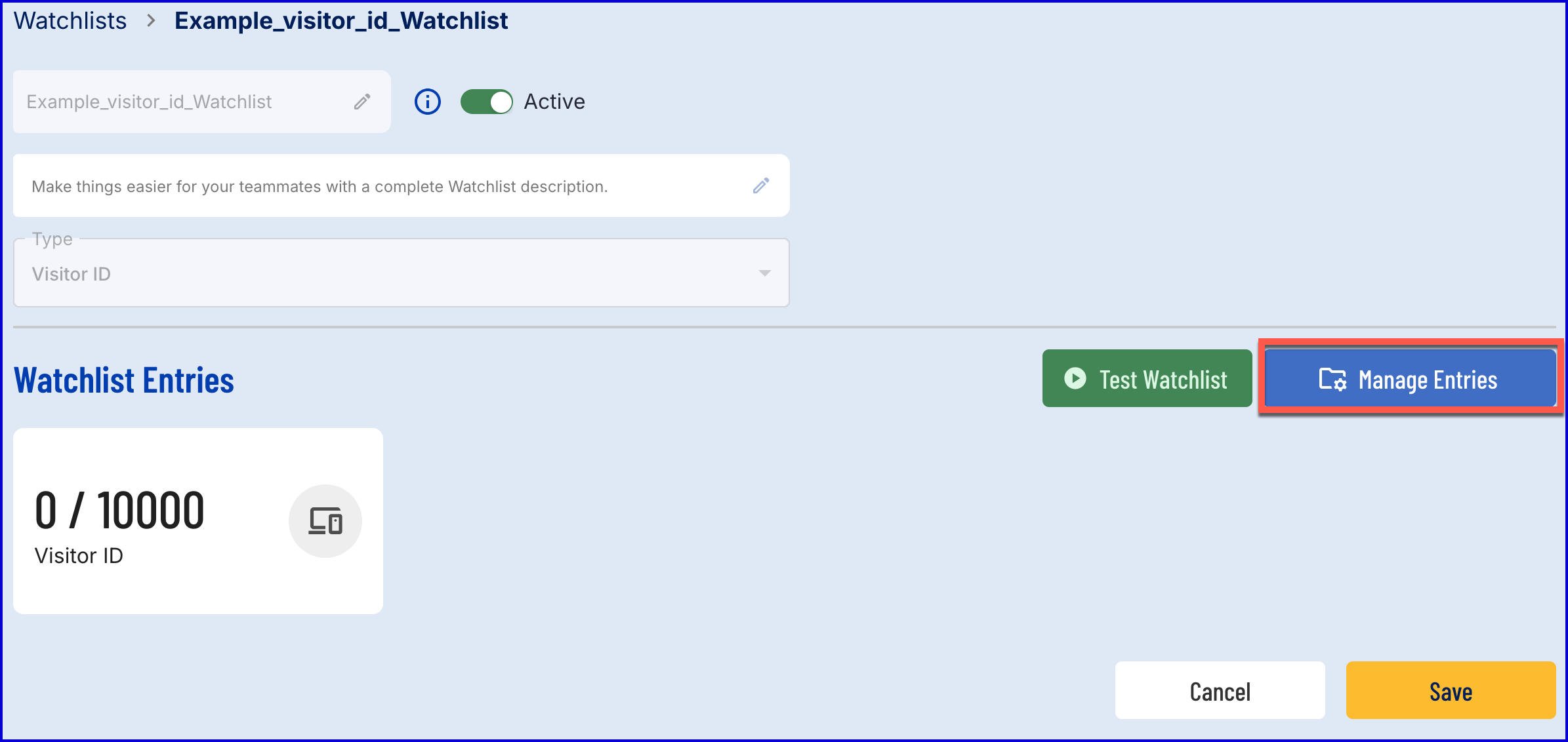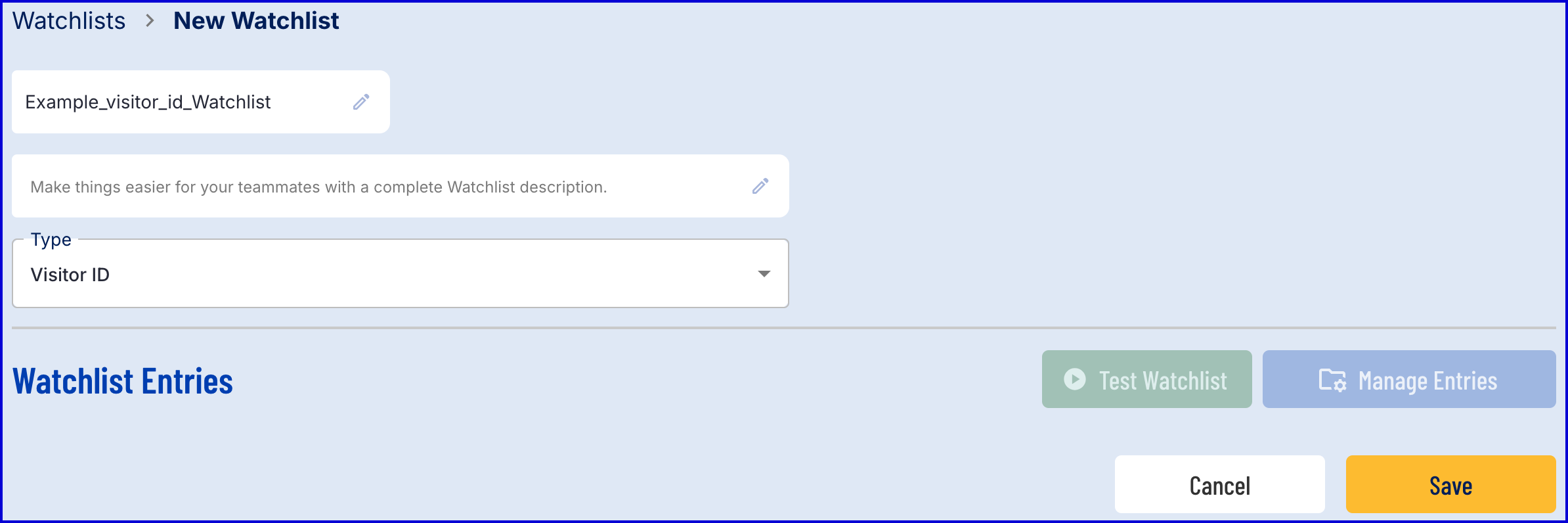 - Set the name of the Watchlist and set the Type to 'Visitor ID'.