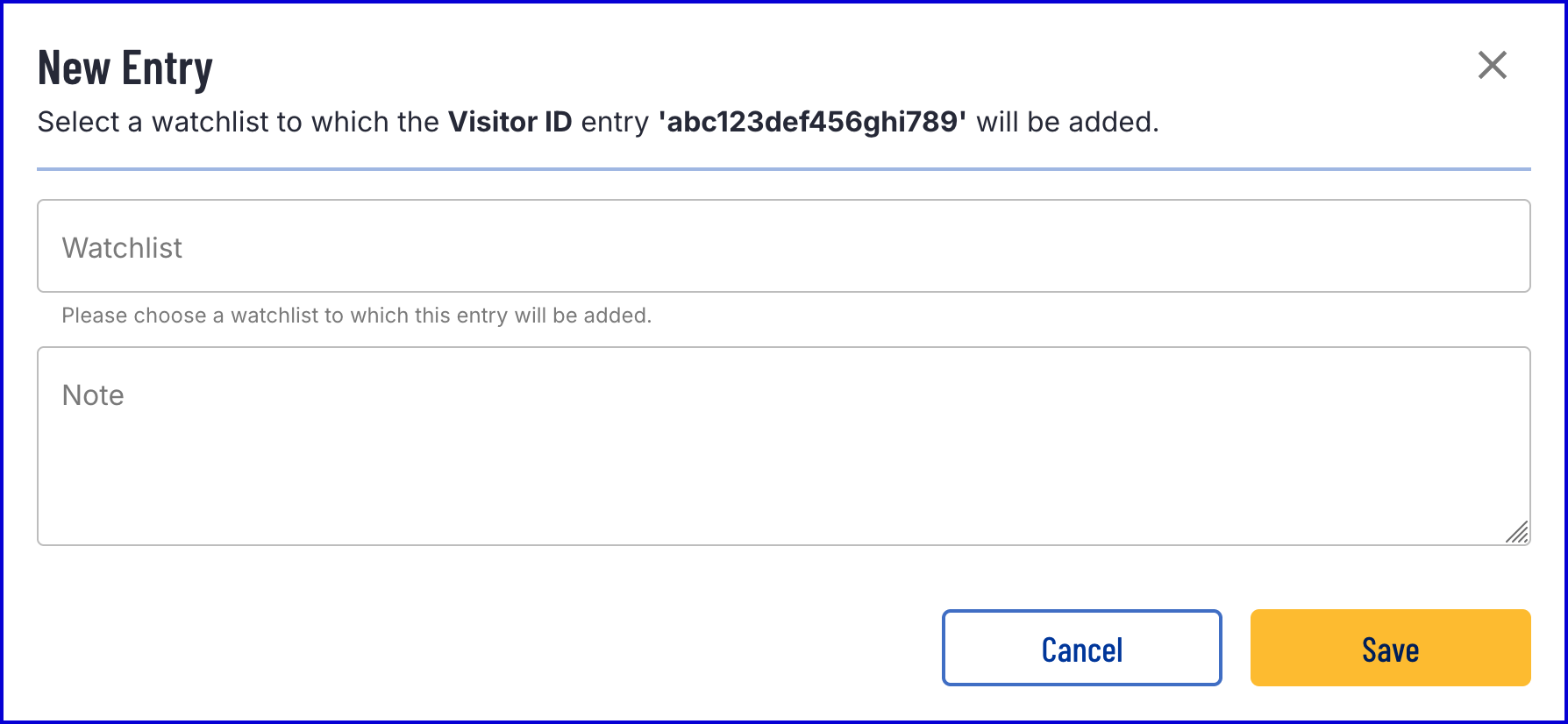 | Watchlist Name | Name of the visitor ID watchlist (max 250 chars) | String |