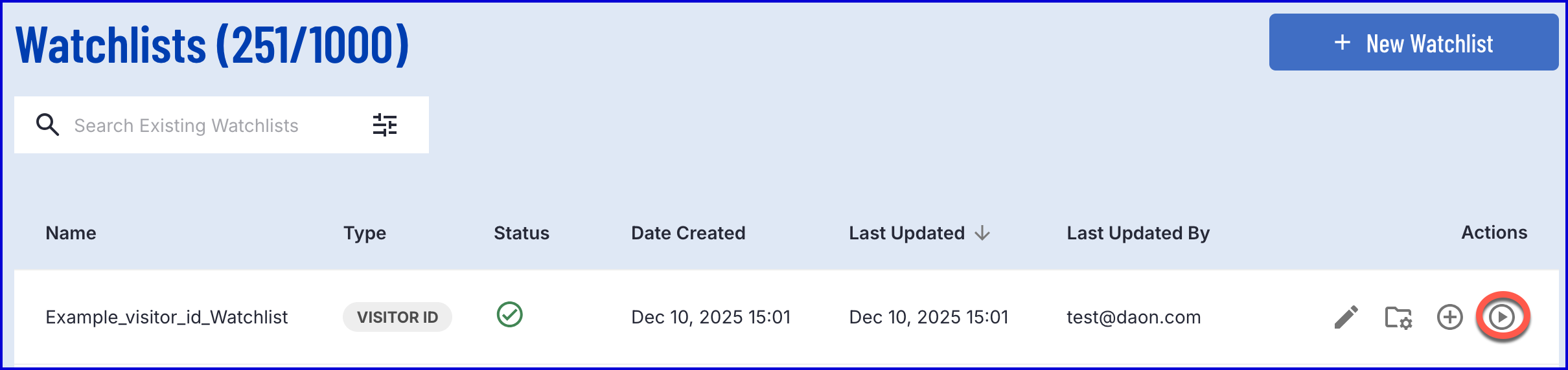 - Find the Watchlist to be tested using the search functionality provided.