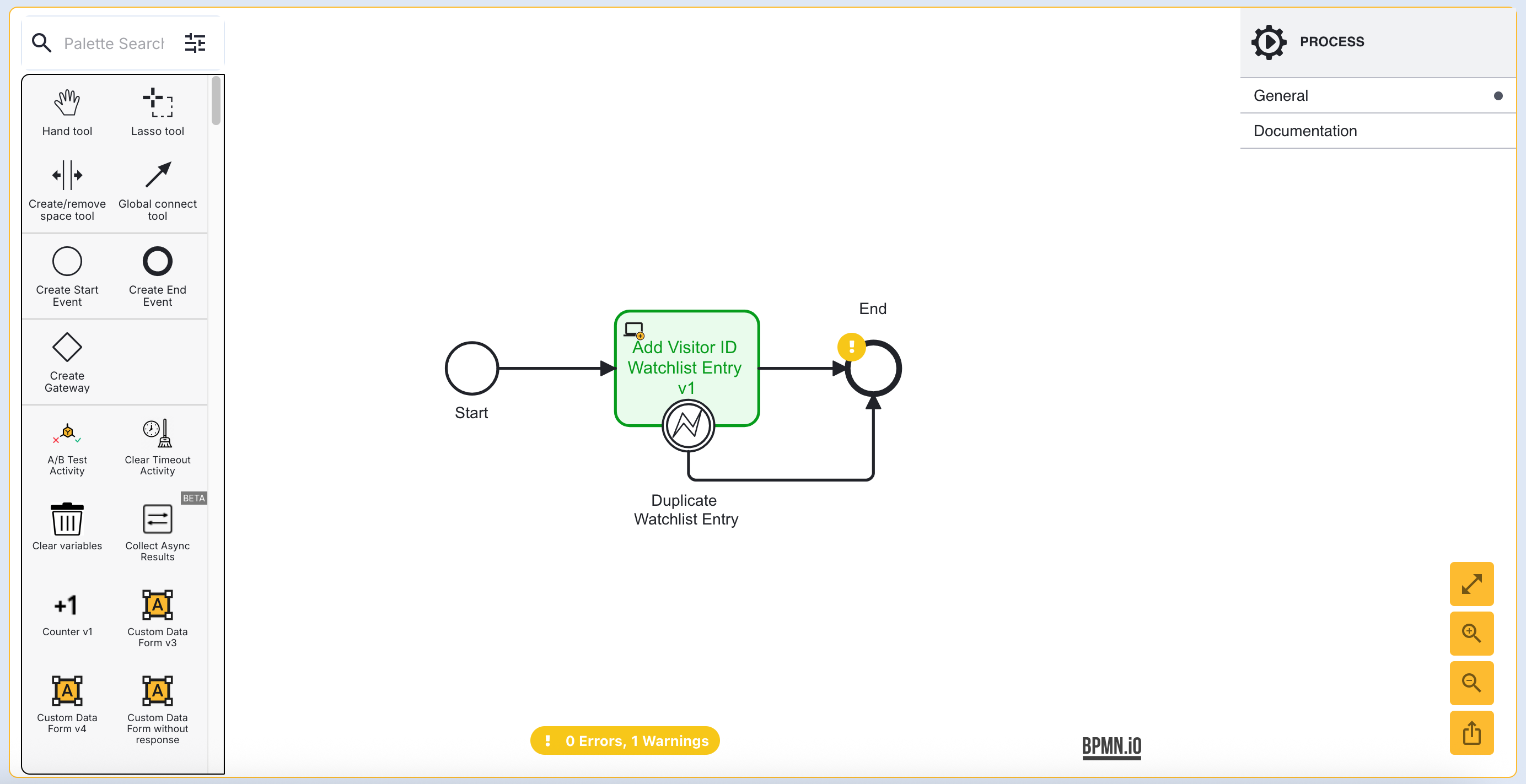 - From the Process Designer, add an 'Add Visitor ID Watchlist Entry v1' activity. Connect the activity to the 'Start' event.