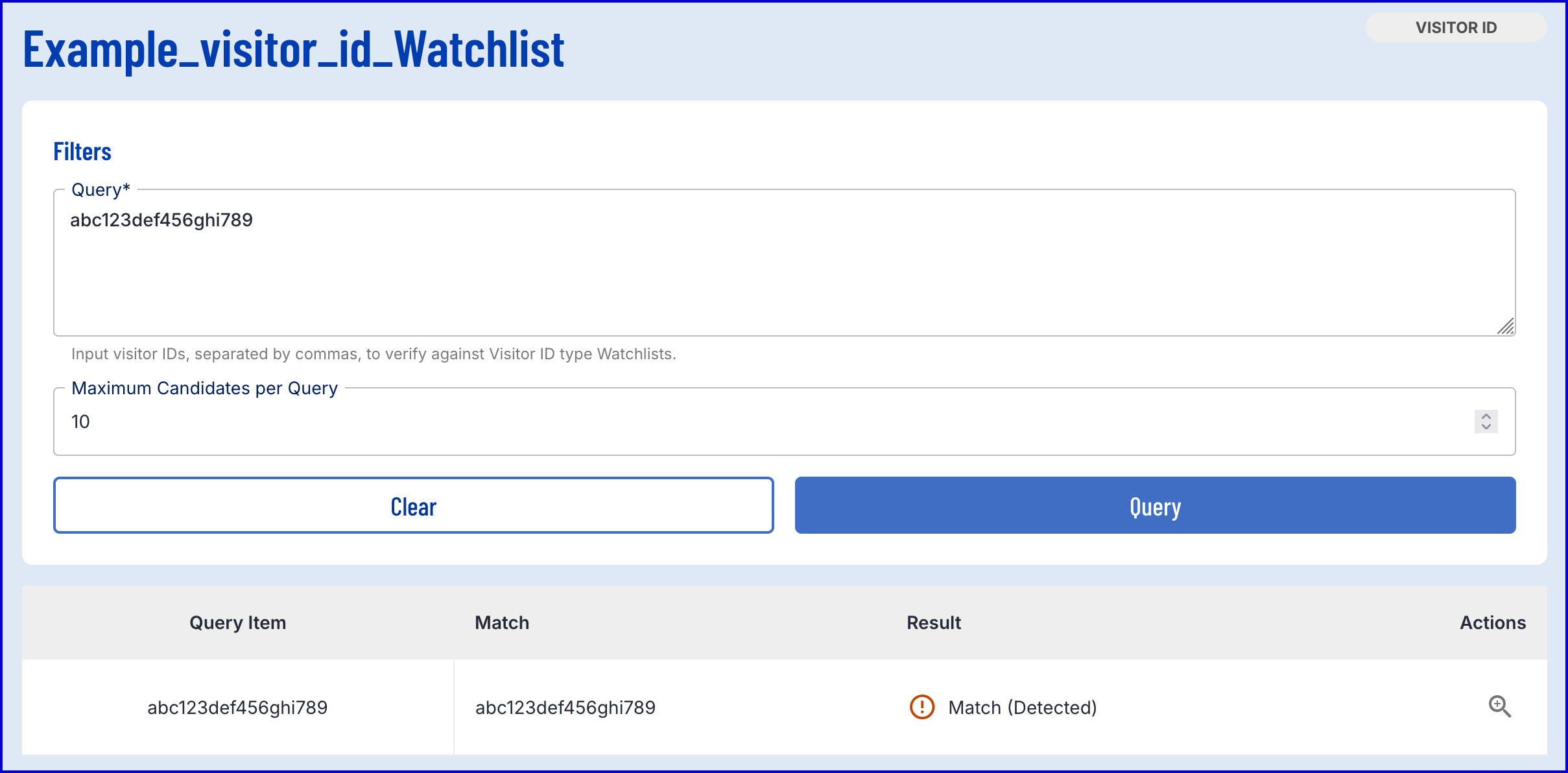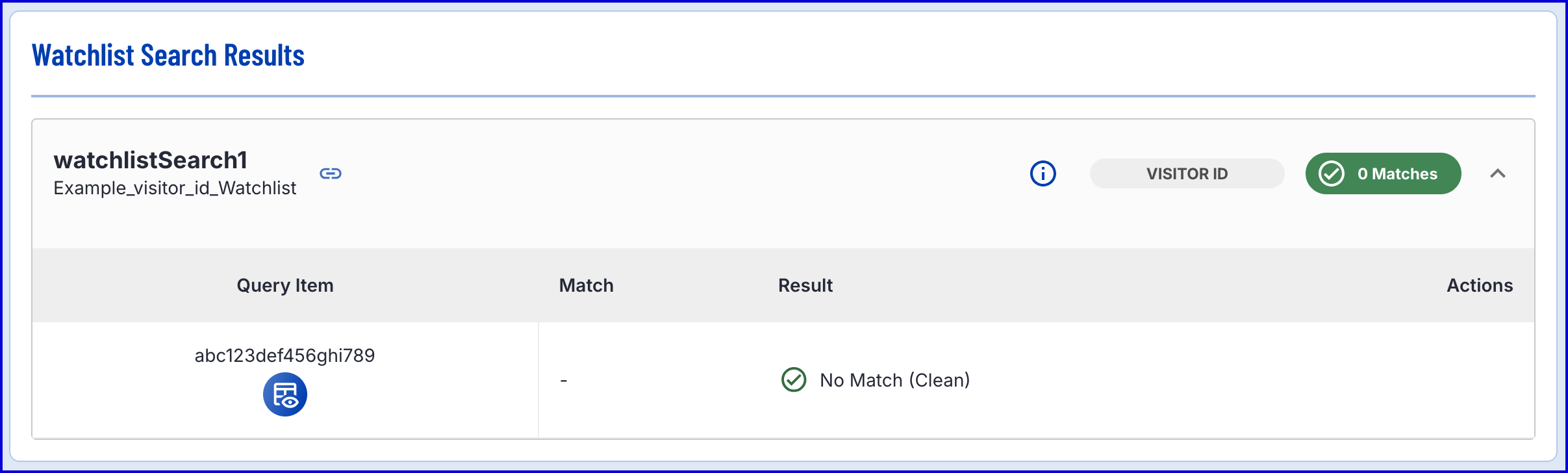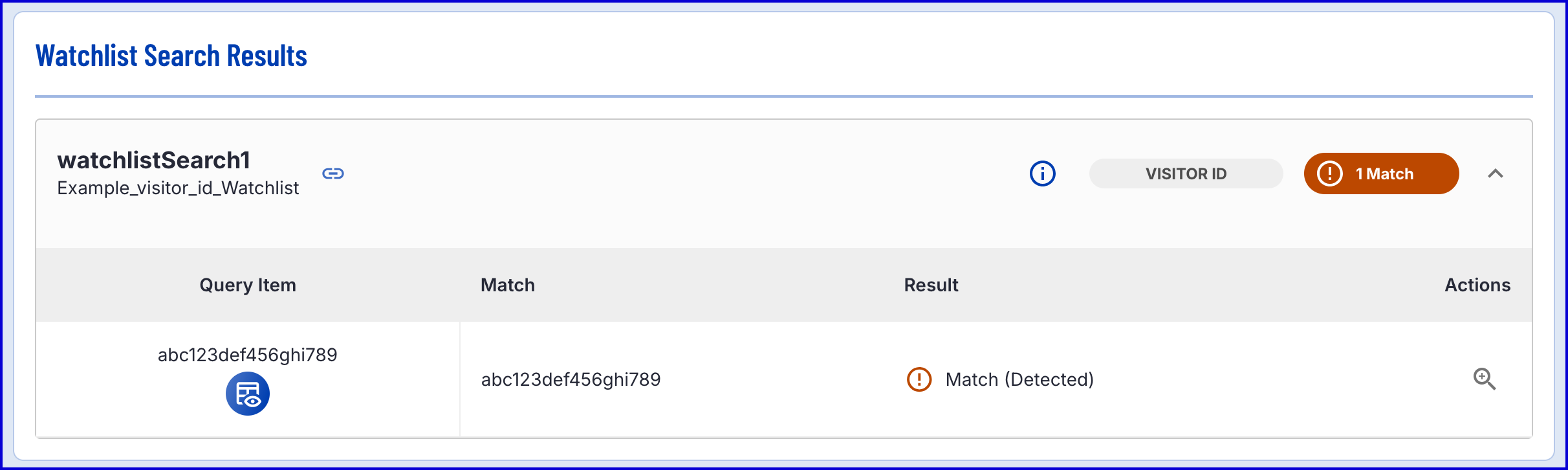 - Actions - In the event of a match, enables users to see additional details about the Watchlist entry that the Visitor ID was matched against.