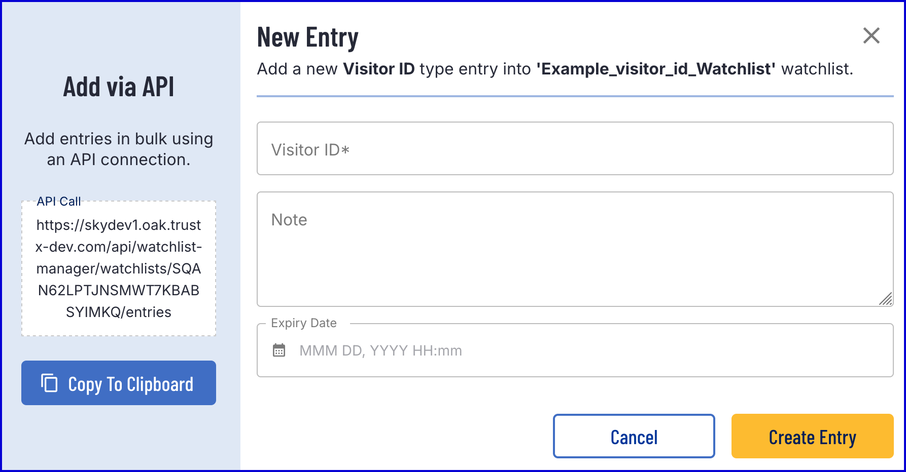 POST https://{{tenant}}.{{region}}.trustx.com/api/watchlist-manager/watchlists/{watchlistId}/entriesContent-Type: application/jsonAuthorization: Bearer {{token}}{ "type": "visitorID", "value": "abc123def456ghi789", "expireAtDtm": "2025-11-17T10:30:00Z"}##